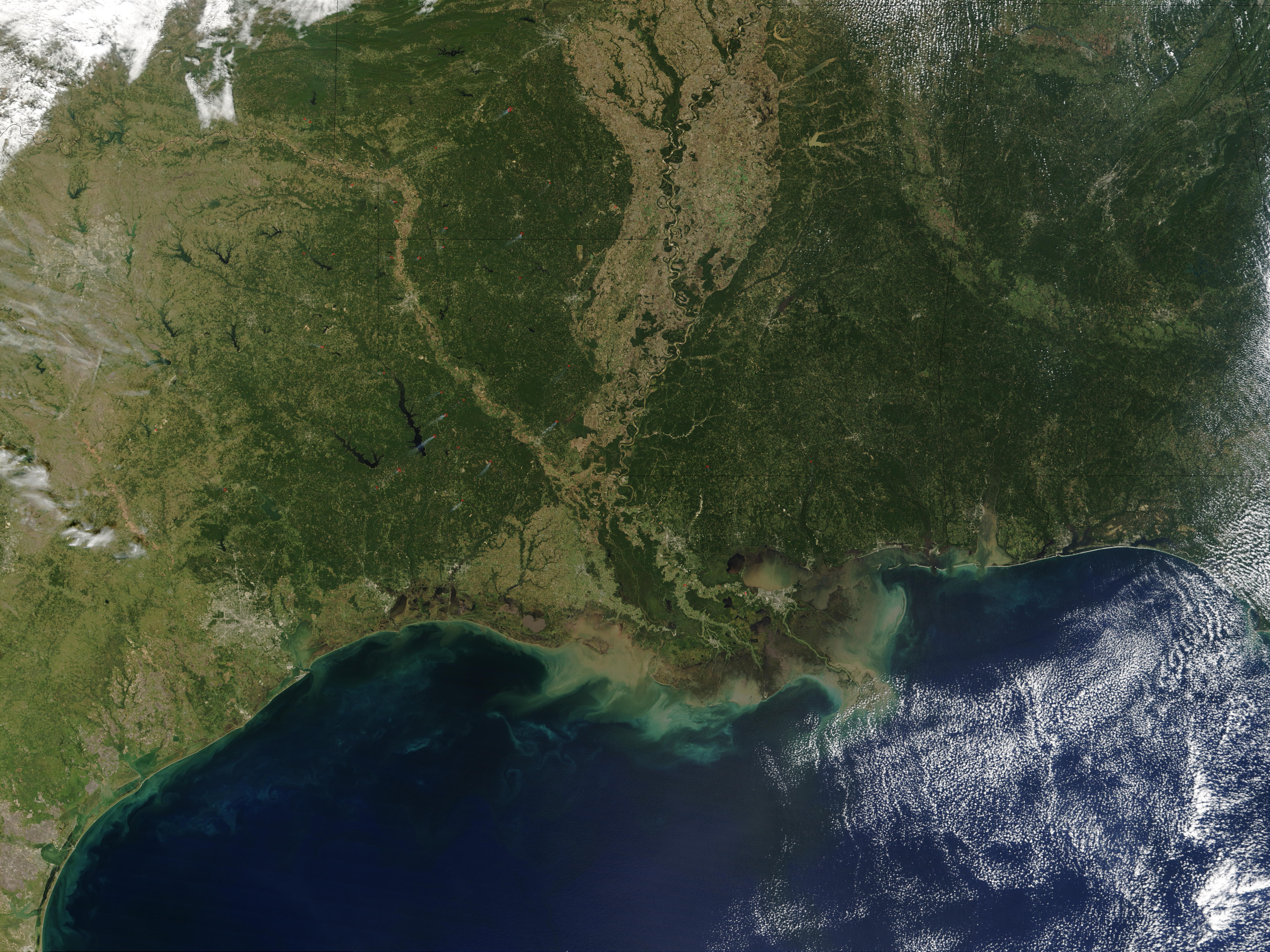 On Wednesday, October 16, 2002, the Moderate Resolution Imaging Spectroradiometer on the Terra satellite captured this true-color image of the southern United States. MODIS detected several fires (red dots) scattered across the region. States shown include Oklahoma and Texas (left column); Arkansas and Louisiana (center column); and Mississippi (right). In Louisiana a few small smoke plumes can be seen drifting southwest. East of image center lies the broad Mississippi River alluvial plain, which appears tan. The coastal waters of the Mississippi Delta are brown with sediment flowing into the Gulf of Mexico. Some sediment may also be churned up by tidal activity.
