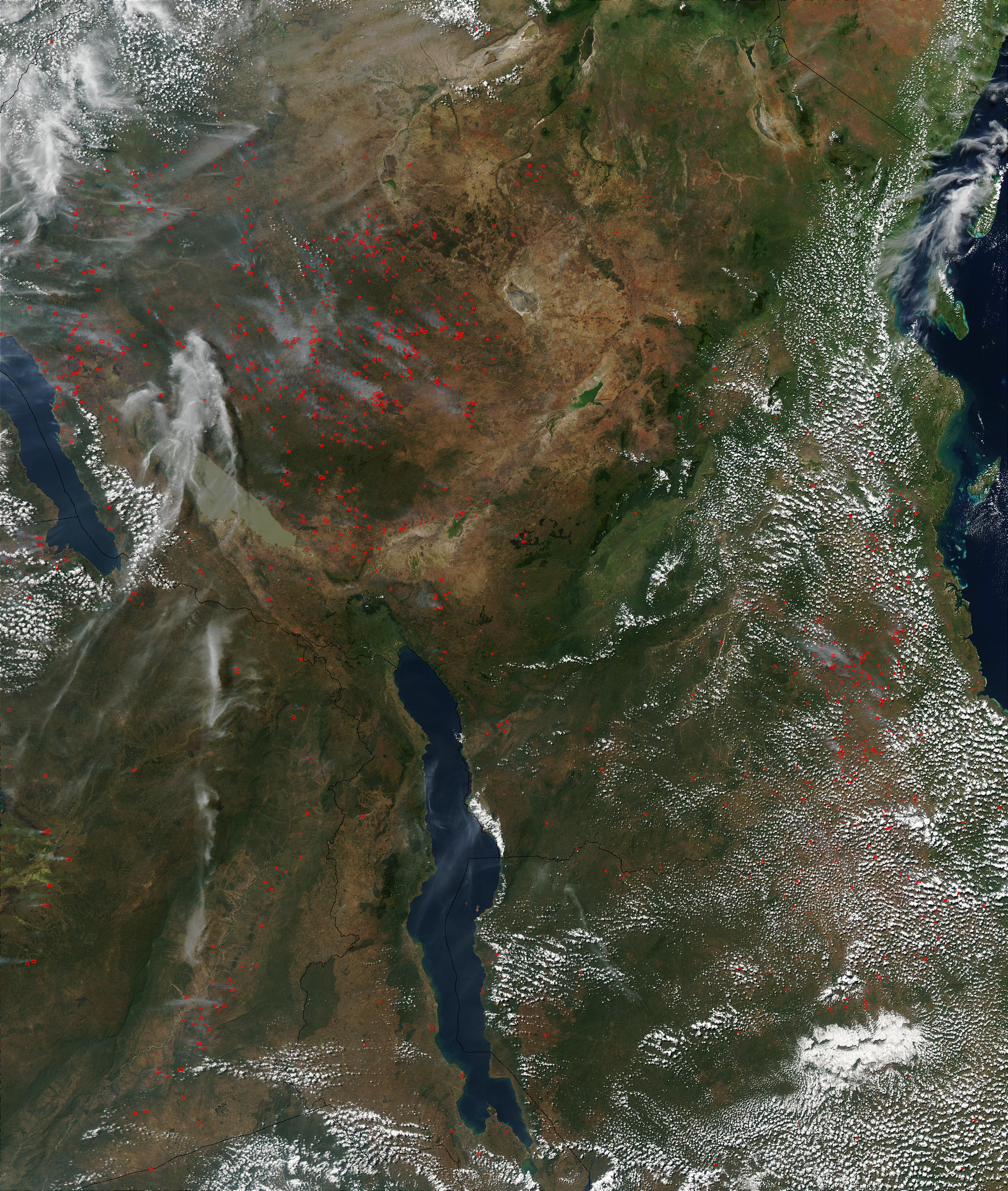 Numerous fires (marked with red dots) were burning across eastern Africa on June 10, 2003. The fires appear most heavily concentrated east of Lake Tanganyika (left edge), but are also scattered across Zambia (bottom left) and Mozambique (bottom right). The fires are part of the typical agricultural burning that occurs in the region, where people set fires to clear land and prepare it for planting and ranching. This Aqua MODIS image was acquired on June 10, 2003.