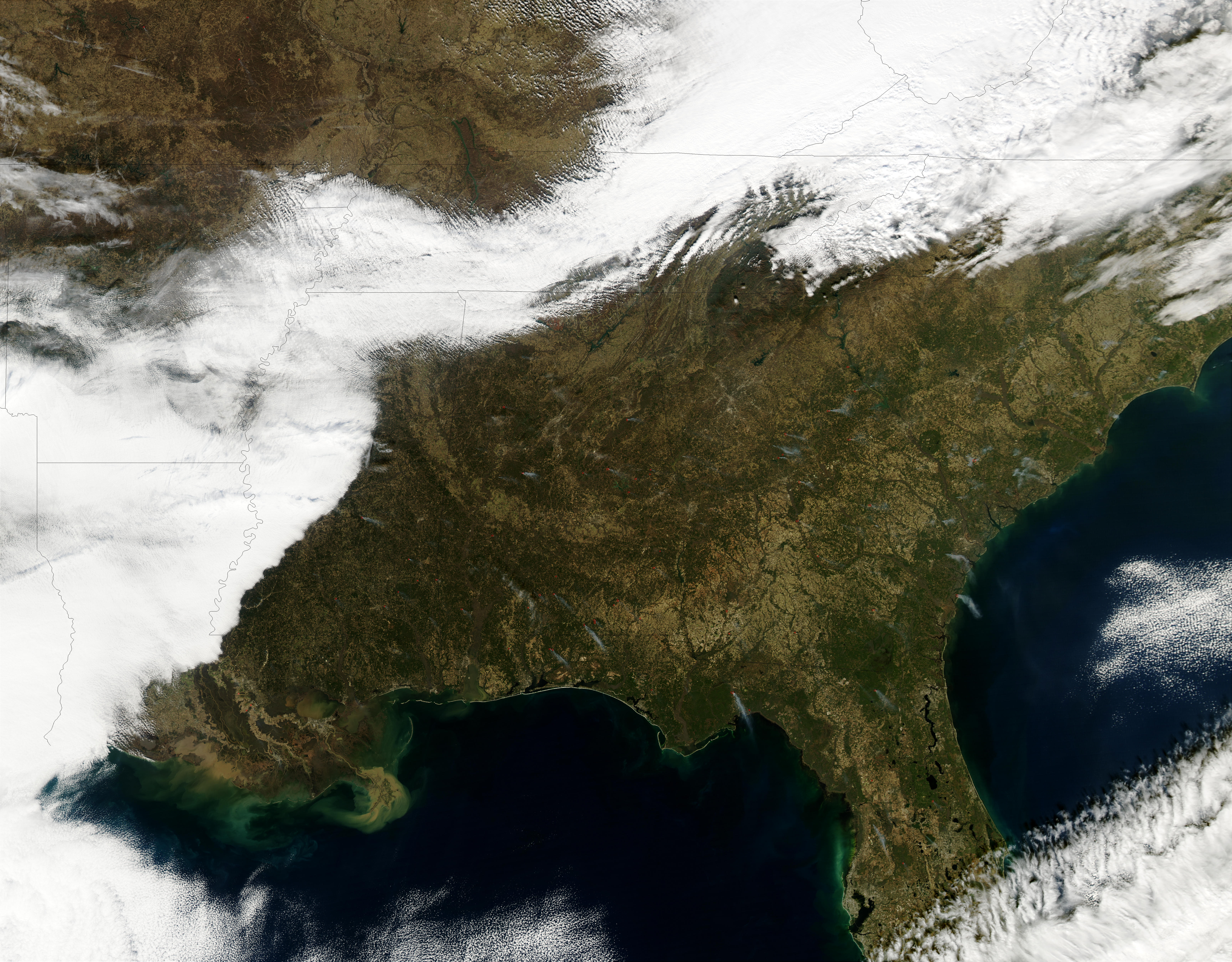 A mixture of prescribed fires and wildfires was burning throughout the southern United States on January 14, 2003. This image was captured by the Moderate Resolution Imaging Spectroradiometer (MODIS) on the Aqua satellite, and shows active fire detection by MODIS marked with red dots. States with fires include (bottom left to right) Louisiana, Mississippi, Alabama, Georgia, South and North Carolina, with Florida in the bottom right corner. According to the January 15 morning report from the Southern Fire Coordination Center of the National Interagency Fire Center, 17 prescribed burns were underway on more than 11,500 acres in Arkansas (visible, but cloud-covered in the high-resolution image), Georgia, Florida, Mississippi, and South Carolina. Dozens of additional small fires were reported on state lands throughout the south as well.