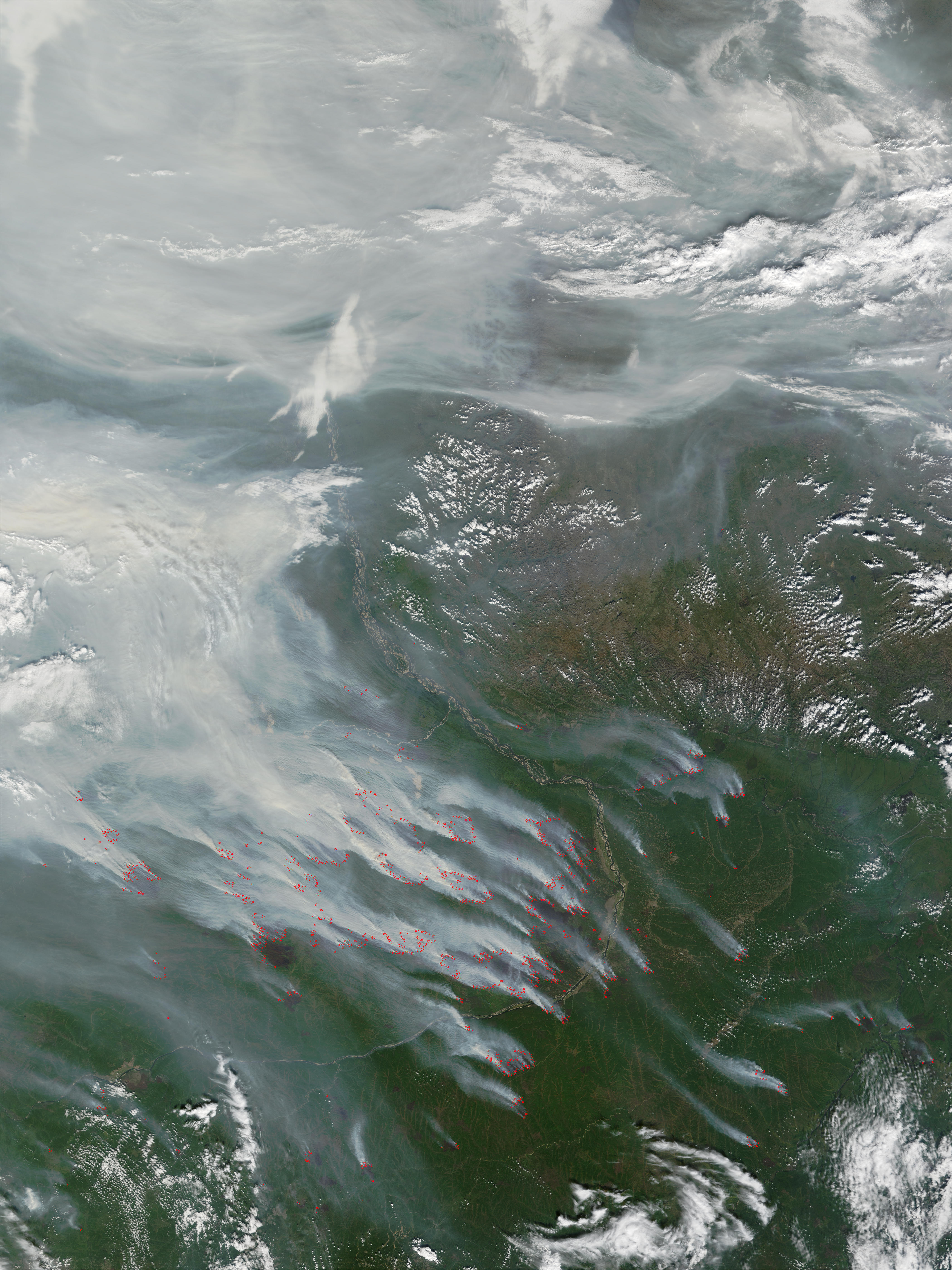 Scores of fires (red dots) along the Lena River (center) in eastern Russia are cloaking the skies over the Central Siberian Plateau with a thick shroud of smoke. This Moderate Resolution Imaging Spectroradiometer (MODIS) image was acquired on August 19, 2002.