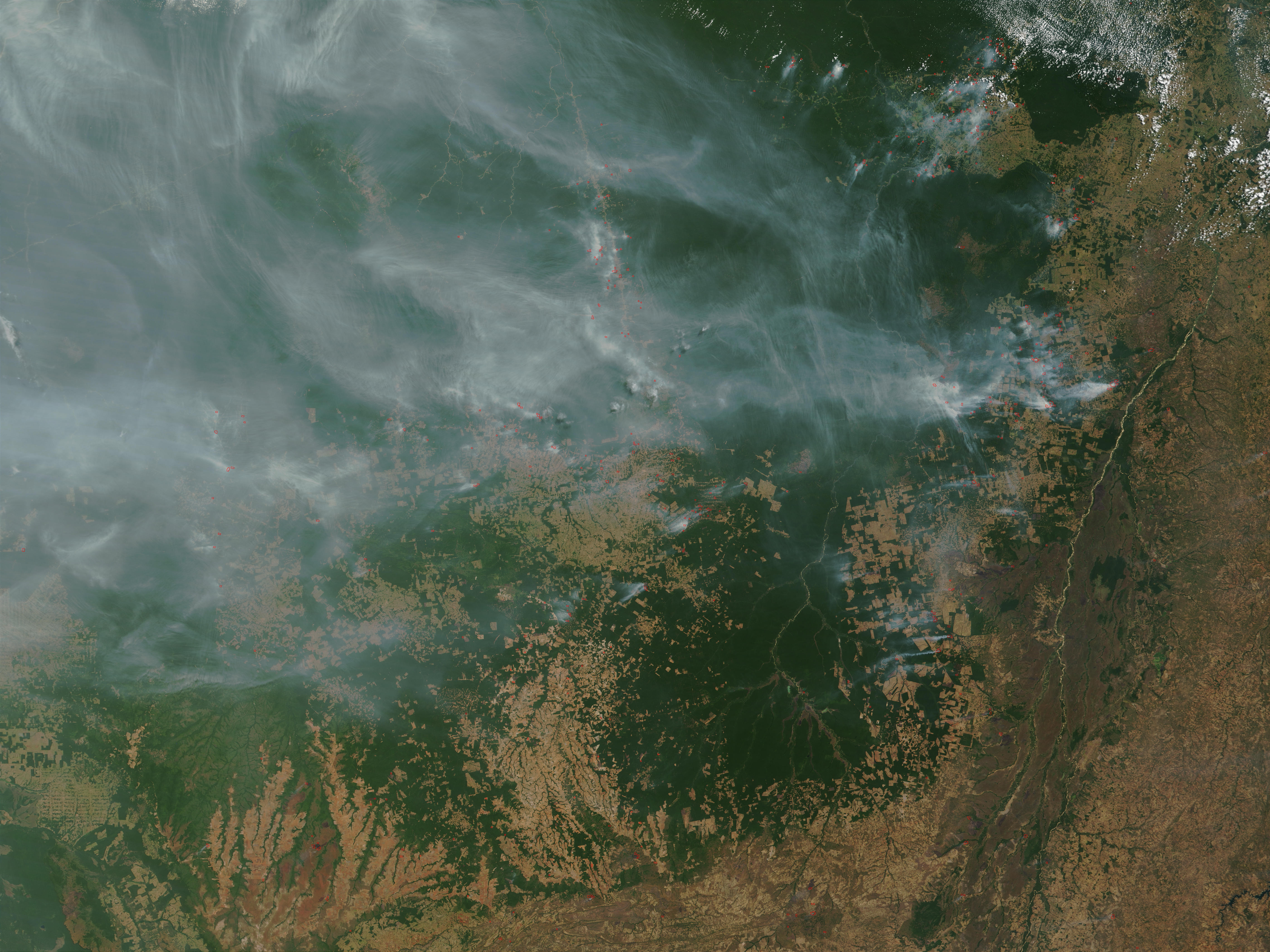 On August 11, 2002, the Moderate Resolution Imaging Spectroradiometer (MODIS) on the Terra satellite detected scores of fires (marked with red dots) burning in northern Mato Grosso in west-central Brazil. Smoke blankets the tropical Amazon forests at the left of the image as fires and deforestation continue to encroach along the margins of the disappearing forests. Slash and burn agriculture is an ongoing problem in the region; even protected areas, such as the Xingu Indigenous Peoples Preserve (right of center, hanging like a pendulum from the intact forests to its north), continue to be threatened by illegal and/or accidental fires. To the east of the Xingu Preserve, the purplish-brown area is a large wetland called the Ilha do Bananal, which runs alongside the Araguaia River.