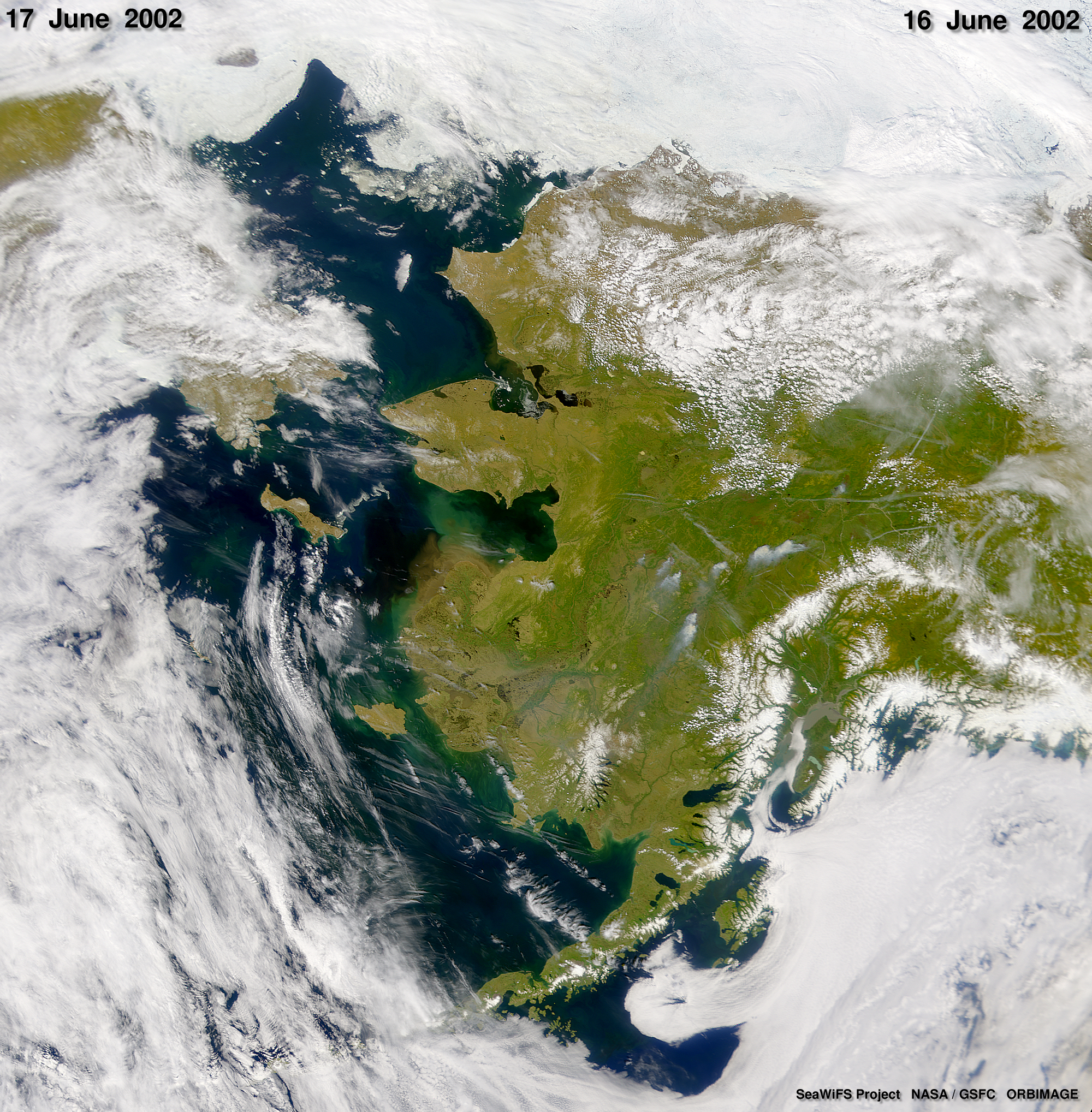 This image from May 16, 2002, from the Sea-Viewing Wide Field-of-View Sensor (SeaWiFS) shows the state of Alaska, including smoke plumes from several fires in the central portion of the state.