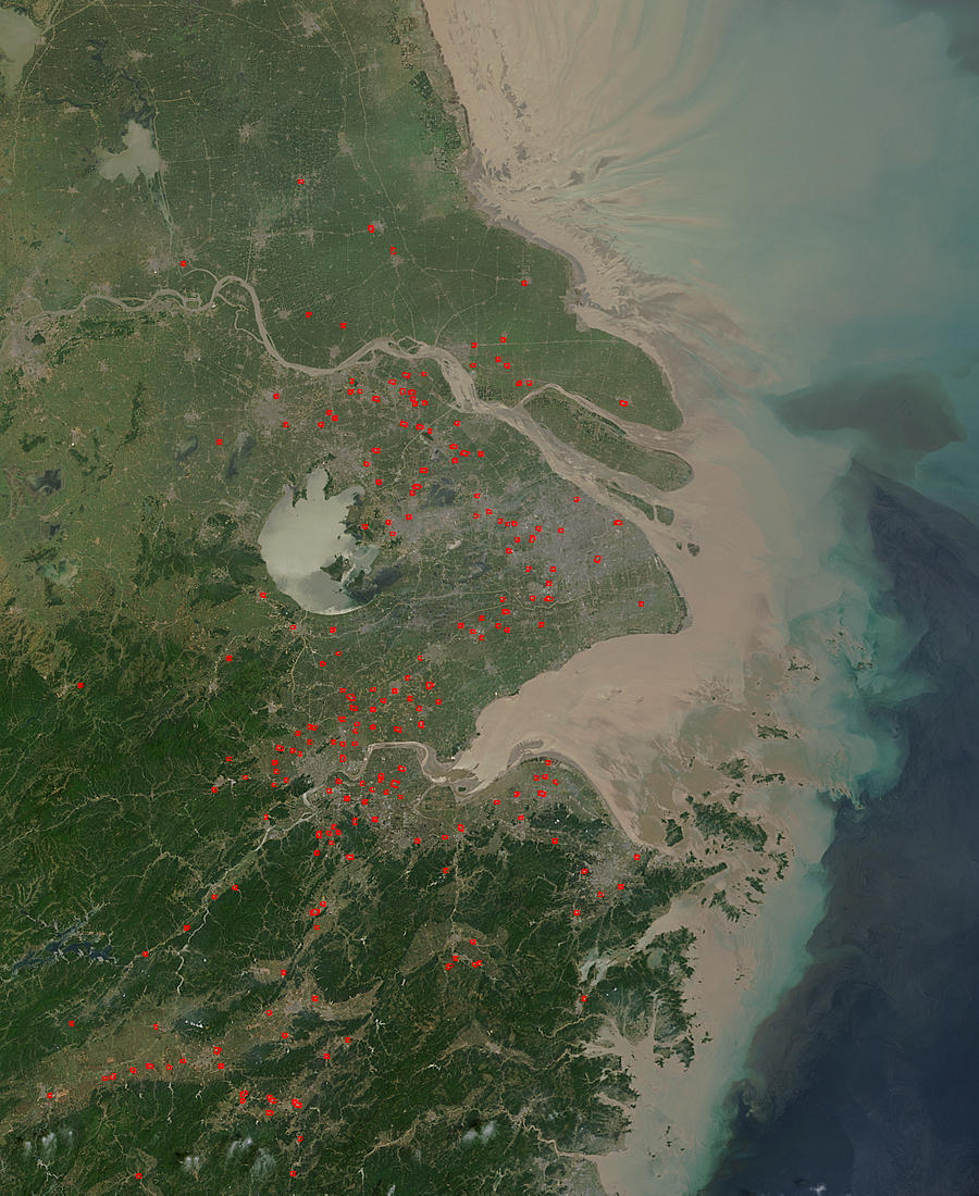 Dozens of fires were burning in eastern China near the mouth of the Yangtze River (top of the image) on May 6, 2004. The fires were detected by the Moderate Resolution Imaging Spectroradiometer (MODIS) on NASA’s Terra satellite during its morning overpass of the region, and have been marked in this image with red dots. The large lake in the left half of the scene is Tai Lake, and to its east, right on the coast, is a gray patch that is the city of Shanghai.