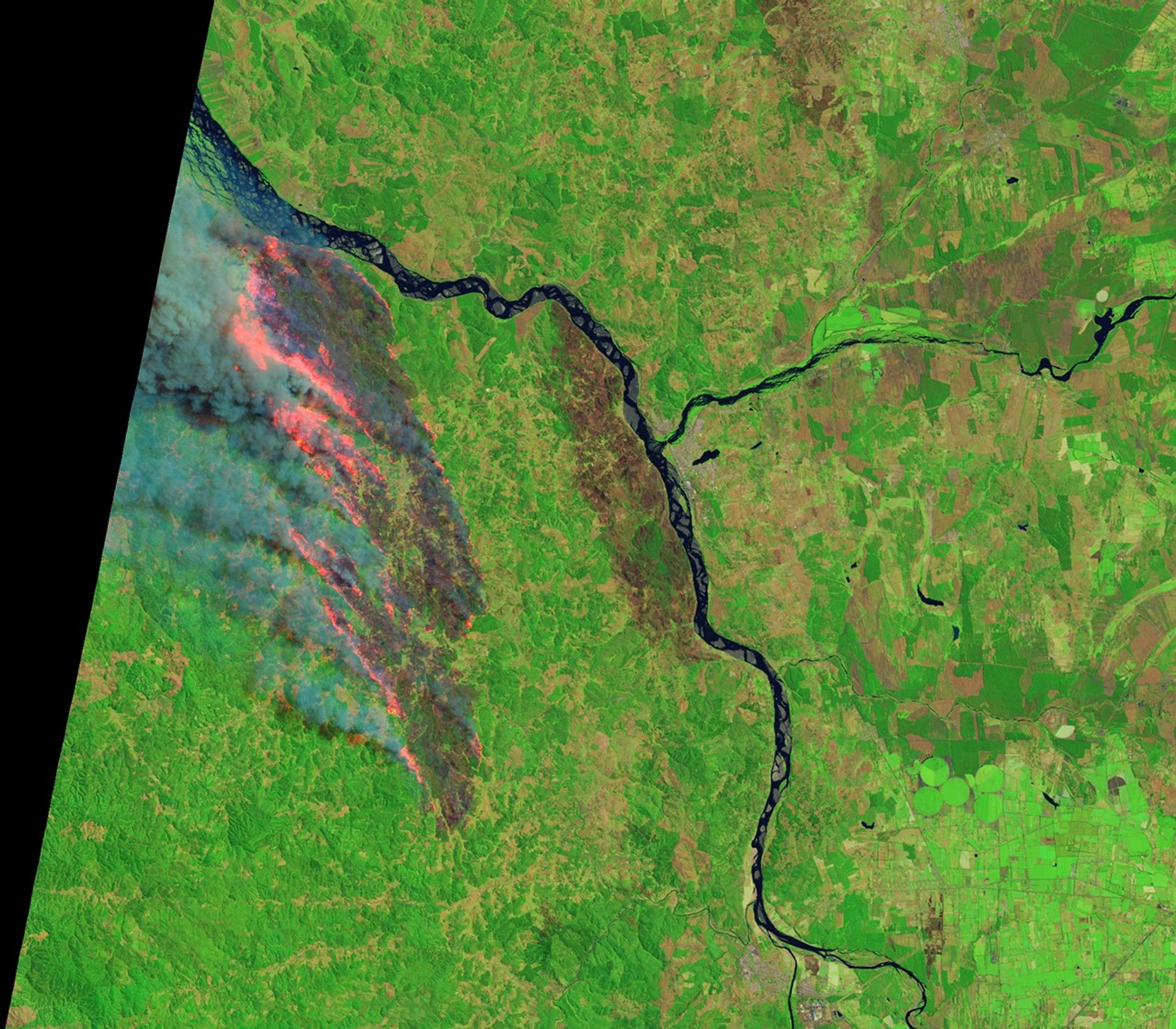 A more detailed view of the fires near Santa Juana can be seen in this false-color image acquired on the same day by the Operational Land Imager (OLI) on Landsat 8. This false-color image combines shortwave infrared, near infrared, and visible light (OLI bands 6-5-3) to make it easier to identify the unburned vegetated areas (green) and the recently burned landscapes (brown). Active fires are shown in red.