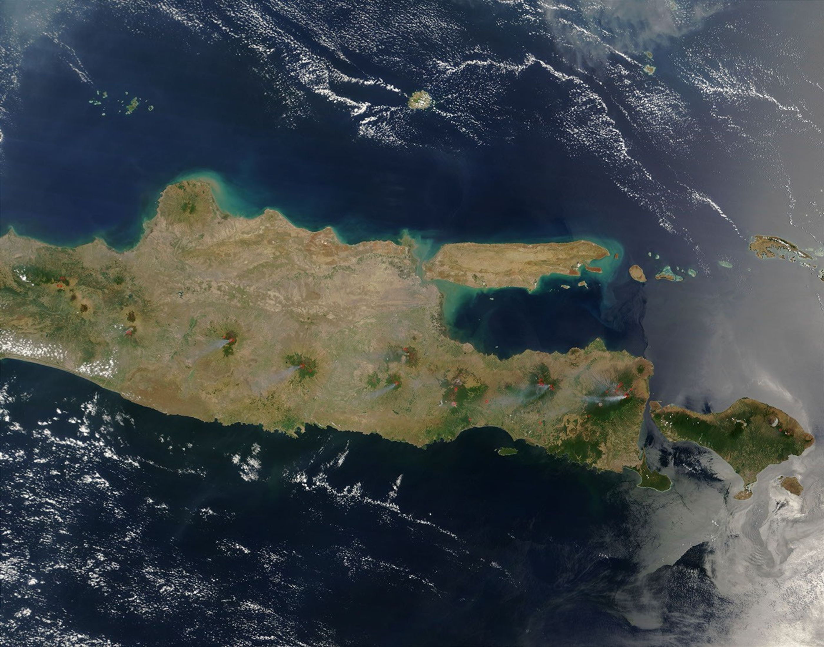 Deforestation has left little intact forest remaining on the island of Java, pictured here in a true-color Moderate Resolution Imaging Spectroradiometer image from October 19, 2002. Even the remaining forest continues to be under pressure from commercial logging and slash and burn agriculture. In this image, islands of forest appear green against the paler landscape. In nearly every patch, MODIS detected active fire (red dots).