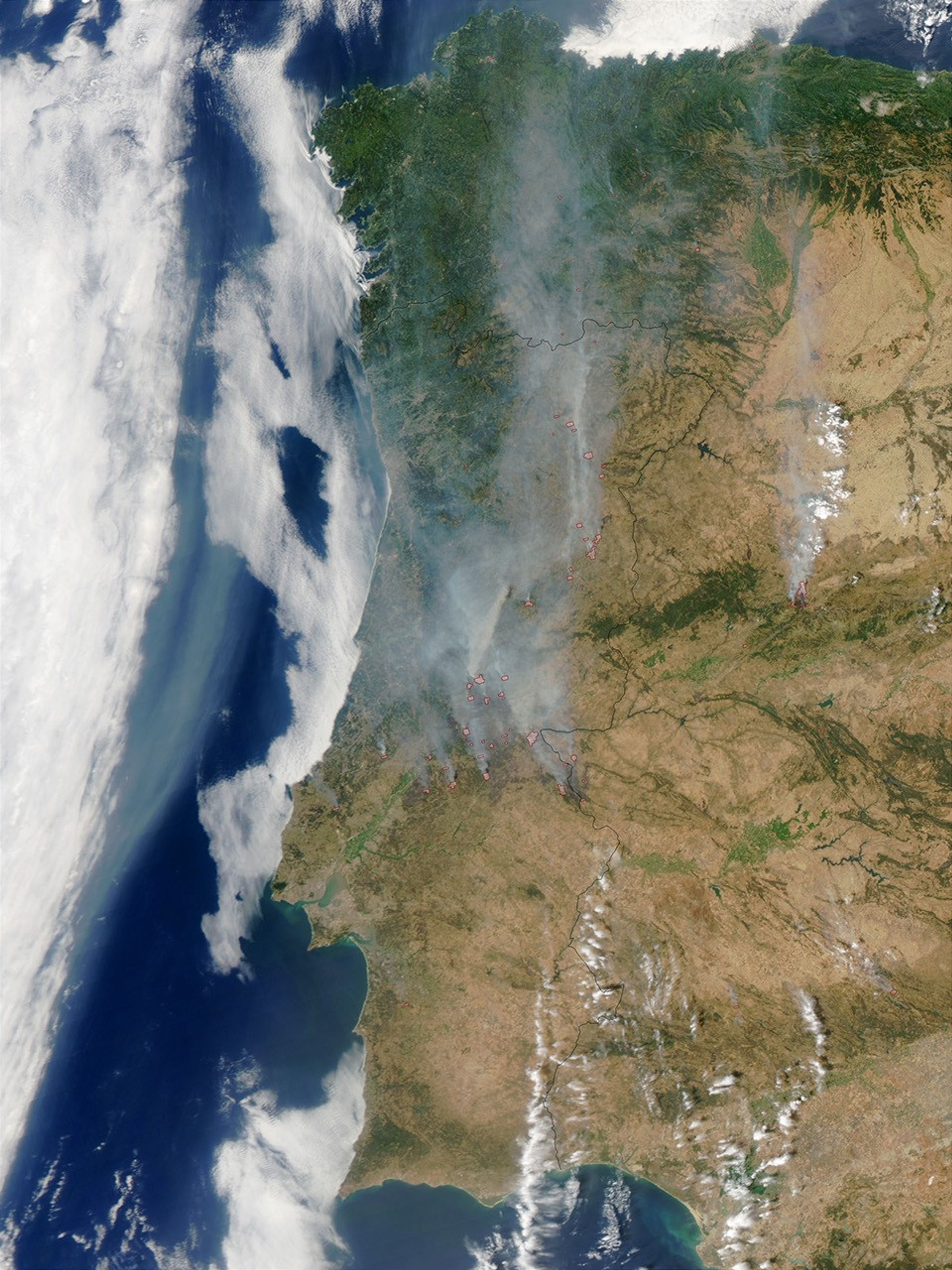 On August 4, 2003, fires (red dots) continued to burn across Portugal (left) and Spain (right), but the large cloud of smoke seen on the previous day had cleared. A severe European heatwave, with temperatures up to 40 degrees Celsius (104 degrees Fahrenheit), is contributing to the explosive growth of the fires. 11 people have died, and 54,000 hectares (135,000 acres) of woodland have been burned. This image was captured by the Moderate Resolution Imaging Spectroradiometer (MODIS) on the Aqua satellite during the afternoon of August 4, 2003.