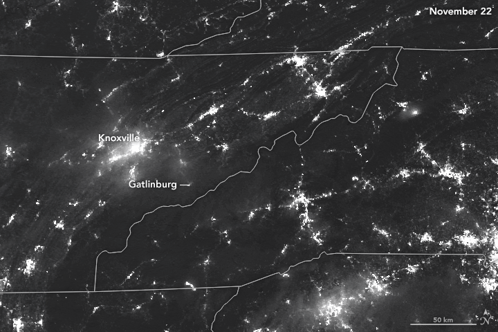 On November 29, 2016, the Visible Infrared Imaging Radiometer Suite (VIIRS) on the Suomi NPP satellite captured a nighttime image of the fire in Tennessee. (For comparison, it is paired with an image of the same area on November 22.) Clouds blocked most of the city lights on November 29, but the blaze was so bright that it illuminated the cloud deck just east of Gatlinburg. The fire was imaged by a special “day-night band” that detects light in a range of wavelengths from green to near-infrared and uses light intensification to detect dim signals.