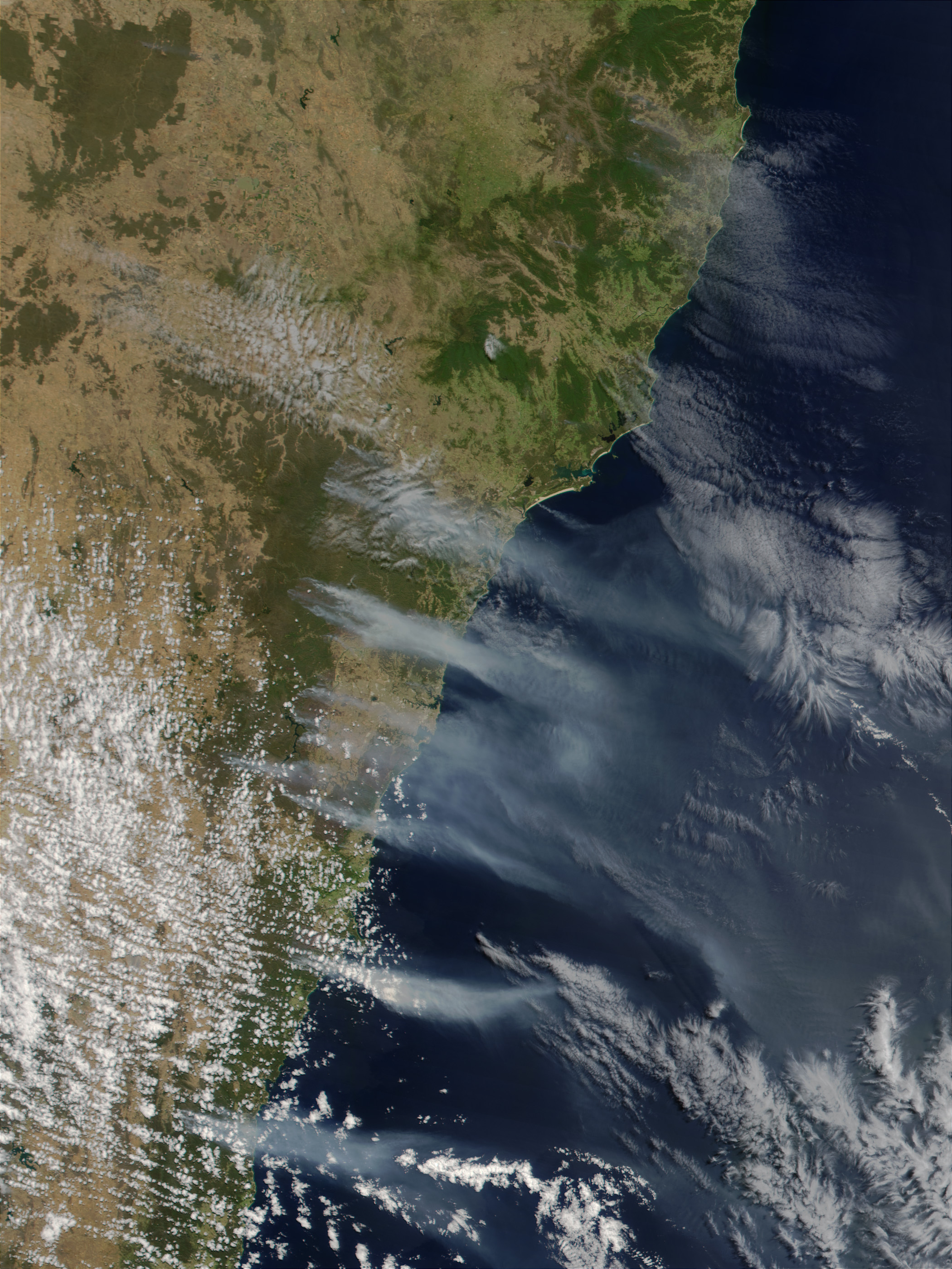 Bush fires surrounding Sydney continue to burn feverishly, and vastsmoke plumes ascend from the southeastern coastline of Australia andextend out over the Tasman Sea. This true-color image from NASA’sModerate-resolution Imaging Spectroradiometer (MODIS) was made fromdata collected on January 2, 2002. More than a dozen active fires are burning in the region, as indicated by the thick plumes of greyish smoke streaming southeastward.