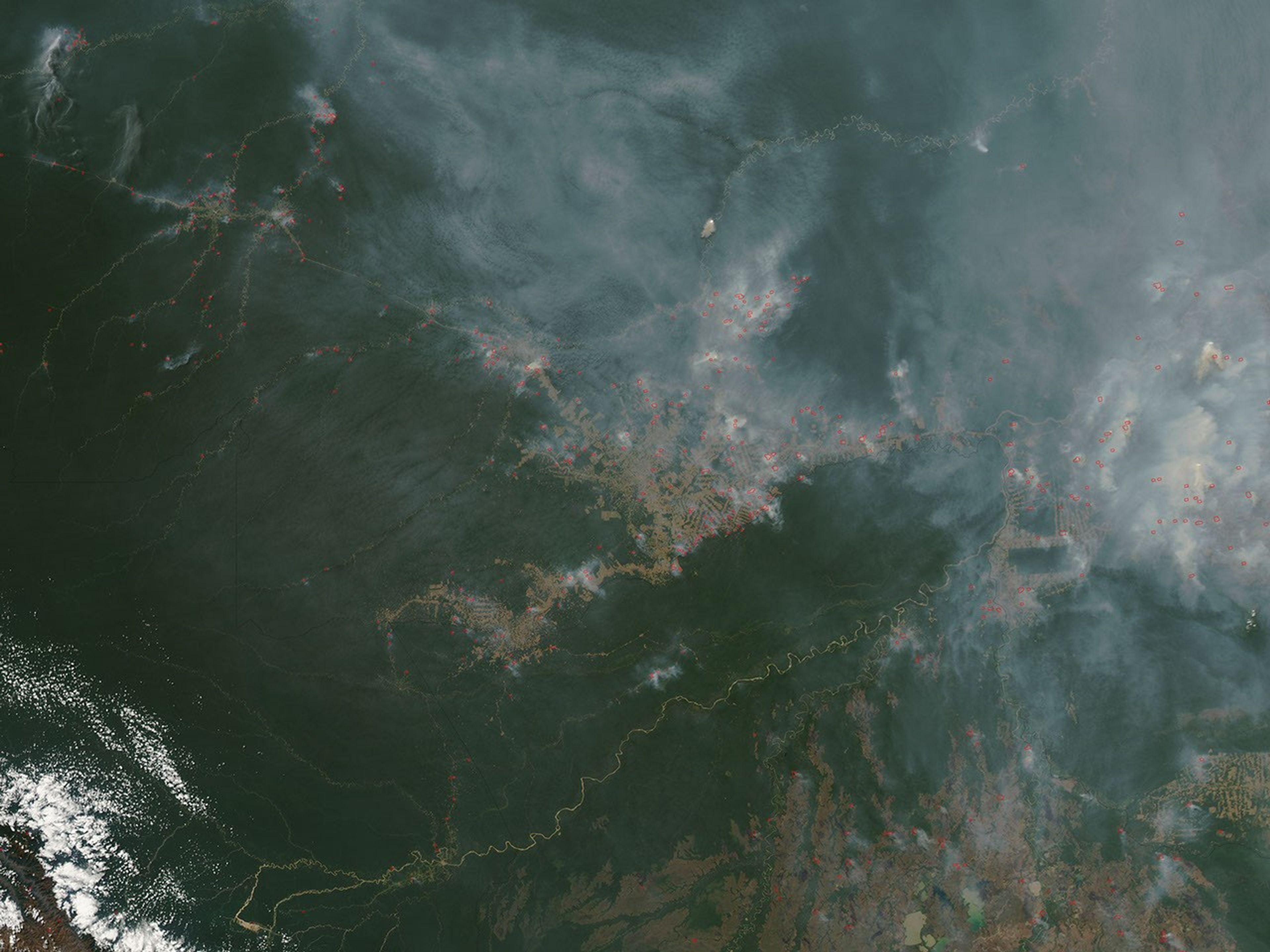 Scattered fires in the heart of the Amazon are visible as red dots in this satellite image. The image was acquired on August 11, 2005, by the Moderate Resolution Imaging Spectroradiometer (MODIS) aboard NASA’s Aqua satellite. Brown deforested areas—farms created by intentional burning— cluster around the small towns of Tarauacá and Feijó. Smoke from additional fires obscures the eastern edge of the image. During the same period an even larger number of fires was raging along the southwestern boundary of the Amazon.