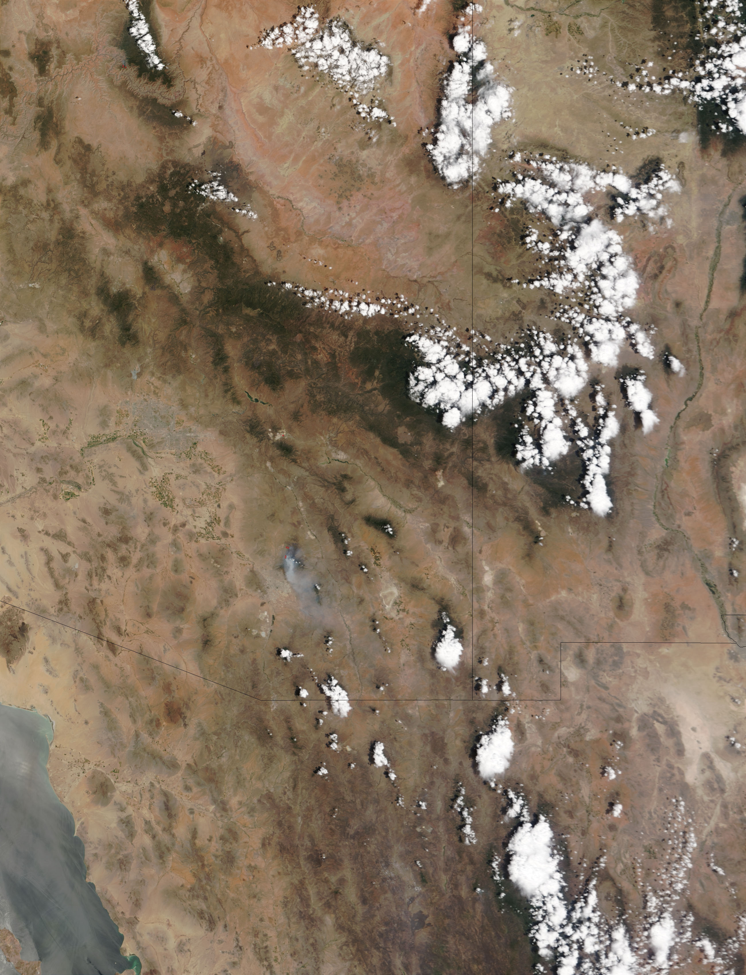 Although the Aspen fire is 65 percent contained, smoke still rises to the north of Tucson, Arizona. This image from the Moderate Resolution Imaging Spectroradiometer (MODIS) shows the fire at 11:30 a.m.(local time) on June 29, 2003. Red areas were actively burning. More than 39,000 acres have burned, mostly in Coronado National Forest. A Burned Area Emergency Response Team is currently examining recently burned areas. They will map the extent and severity of the fire to help mitigate potential future hazards such as landslides.
