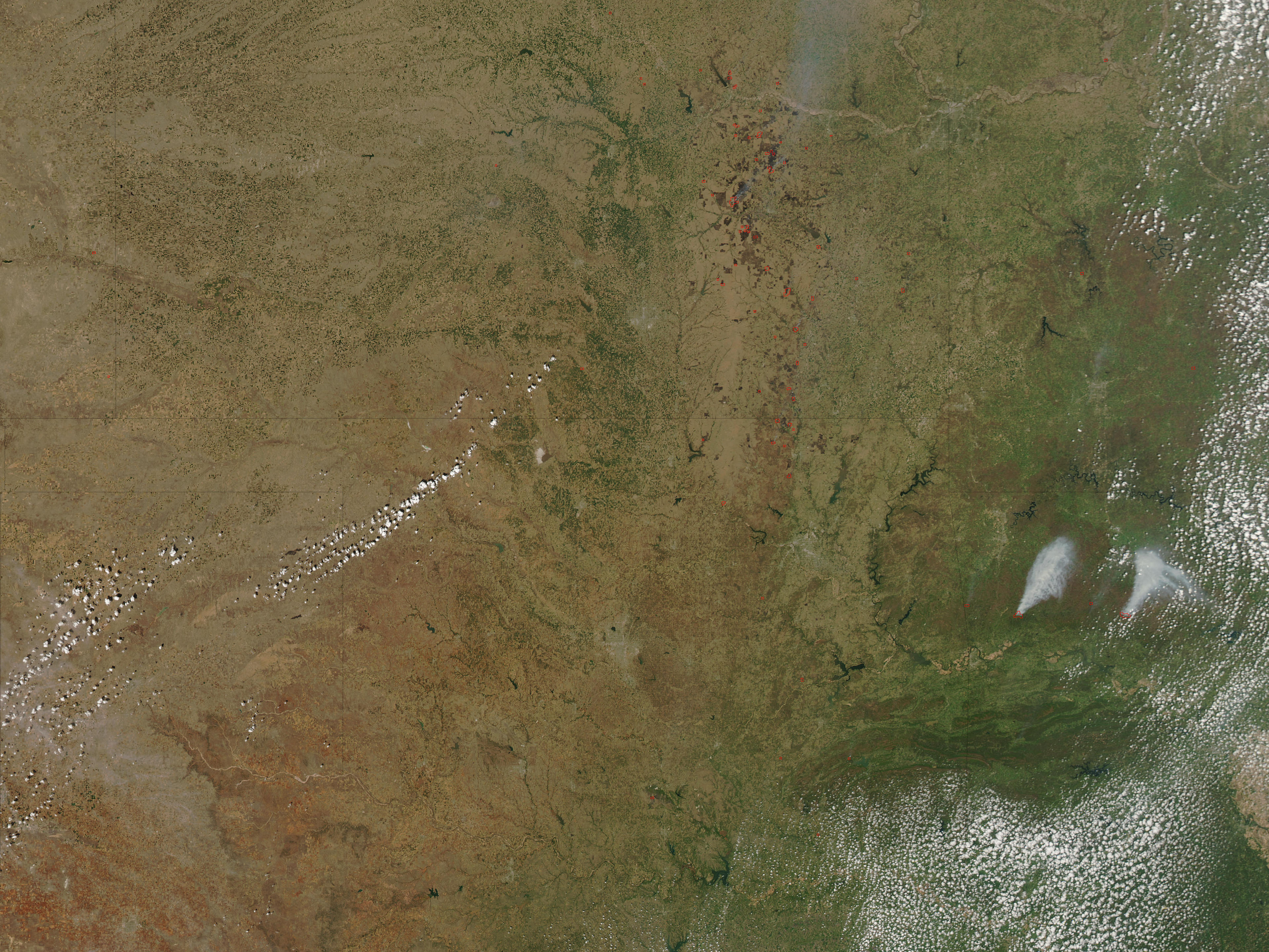 On the afternoon of April 13, 2006, the Moderate Resolution Imaging Spectroradiometer (MODIS) on NASA’s Aqua satellite detected two smoky fires burning in northwestern Arkansas’ Boston Mountains when the sensor passed over head and collected this image. The actively burning part of the fire detected by MODIS is outlined in red. Both fires have large plumes of smoke drifting northward. The Arkansas River runs through the image’s bottom left corner, while at top, Beaver Lake sits just south of the Missouri state line. The topography of the area is highlighted by the still-dormant vegetation of the higher elevations of the mountains, which appears brown.