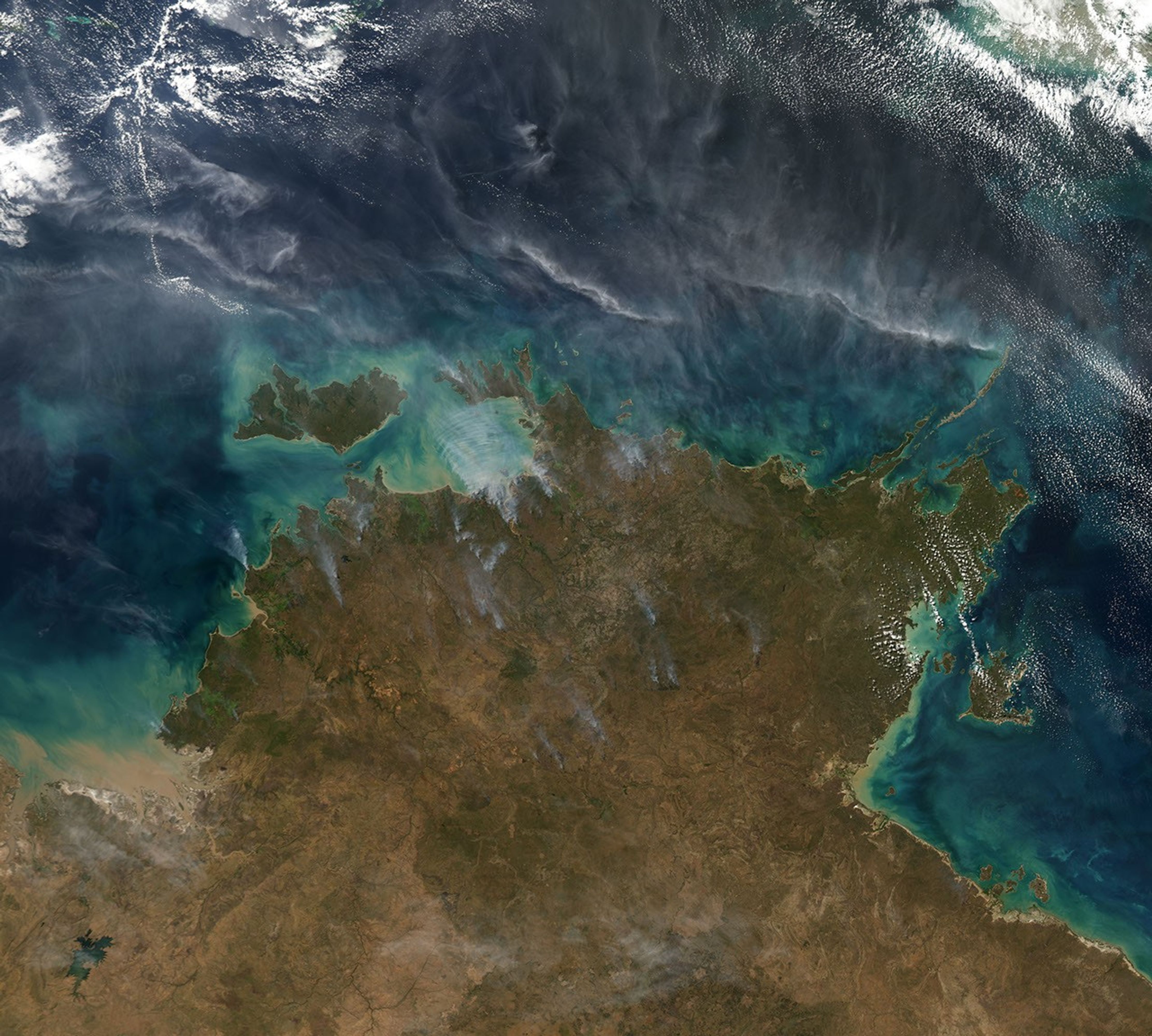 The large image provided above is at MODIS’ maximum spatial resolution (level of detail). Twice-daily images of Arnhem Land are available from the MODIS Rapid Response Team in additional resolutions and formats, including a false-color version that highlights the location of burn scars.