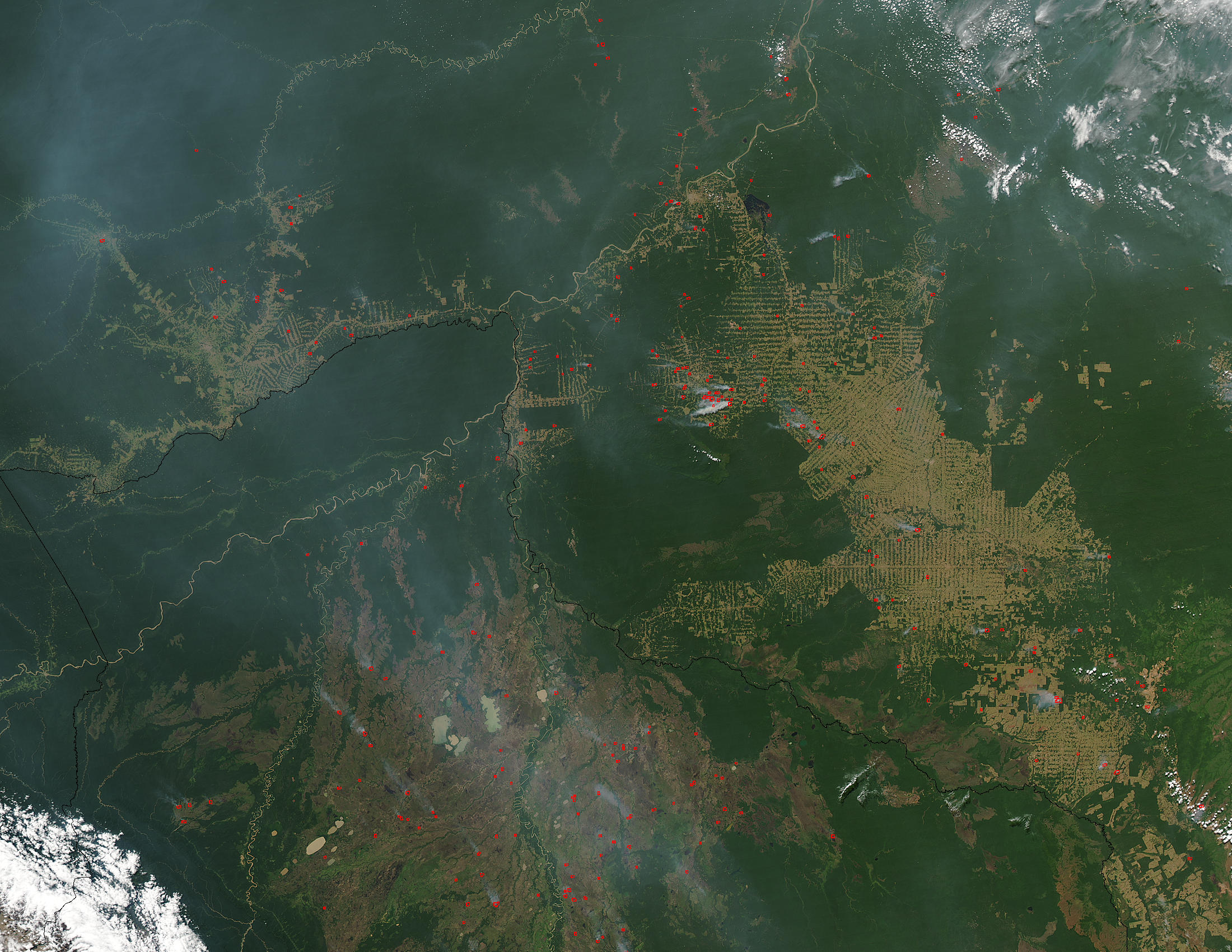 Development and agriculture continue to push their way into the Amazon Rainforest of western Brazil. Tan-colored lines and rectangles in this Moderate Resolution Imaging Spectroradiometer (MODIS) image from August 11, 2003, mark out land cleared of forest (deep green). Much of the deforestation has occurred in Rondonia state, which covers the image at right, southeast of the Madeira River, which runs through the top center of the image. North of the Madeira River, a road pushes into Amazonas, with numerous fires (red dots) suggesting more clearing may be underway. Left of image center, the forests of the Pando region of Bolivia remain undisturbed.