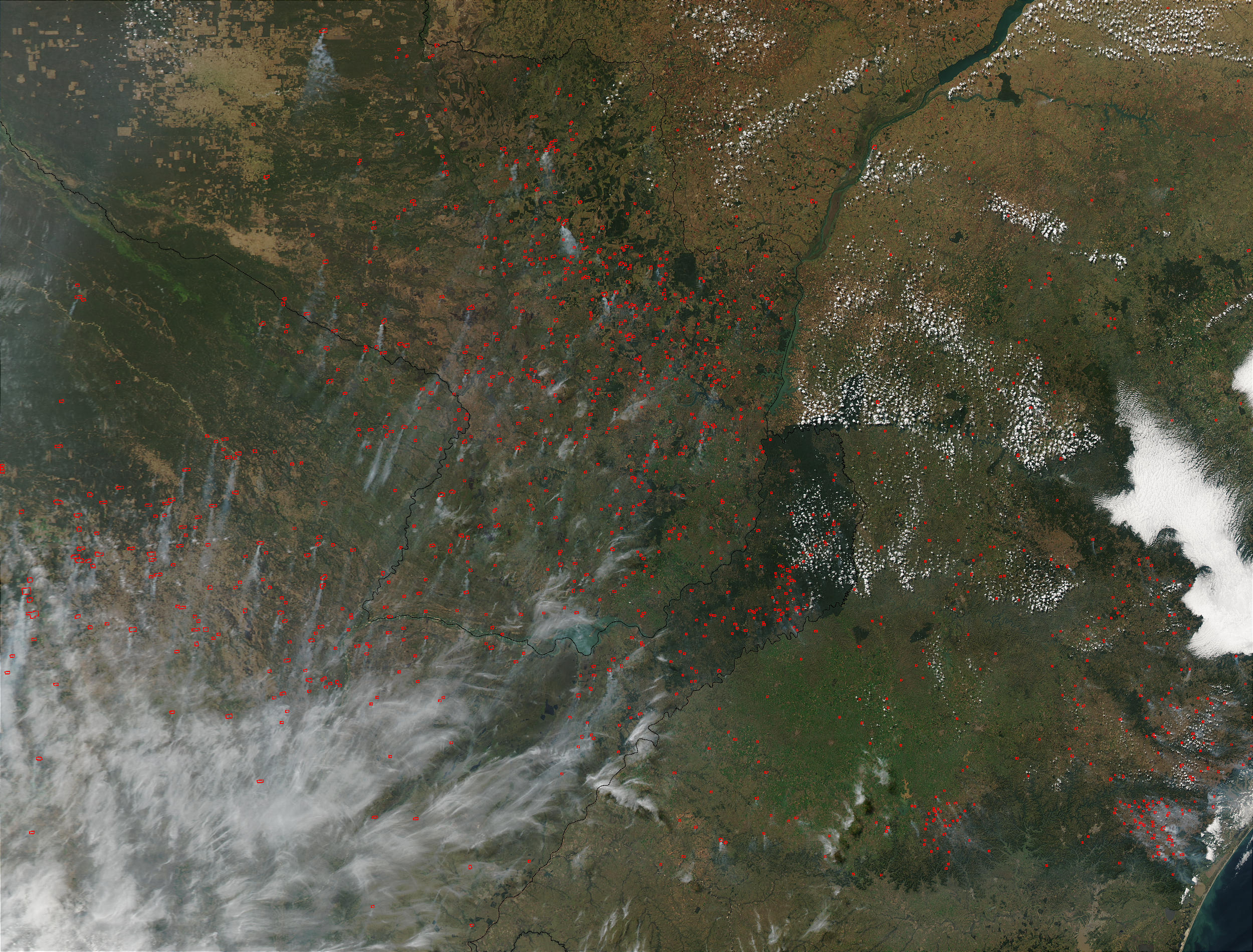 Hundreds of fires were detected across South America by the Moderate Resolution Imaging Spectroradiometer (MODIS) on the Aqua satellite on August 1, 2003. Fires (red dots) were detected in Brazil (right), Argentina (bottom left), and Paraguay (top left). Biomass burning is concentrated during the months of July-October in the Southern Hemisphere portion of South America, and is linked to agricultural activities, including the use of fire to permanently deforest areas and convert them to agricultural land. In the image, isolated patches of intact forest appear deep green, while agricultural lands and tropical savannas appear lighter green.