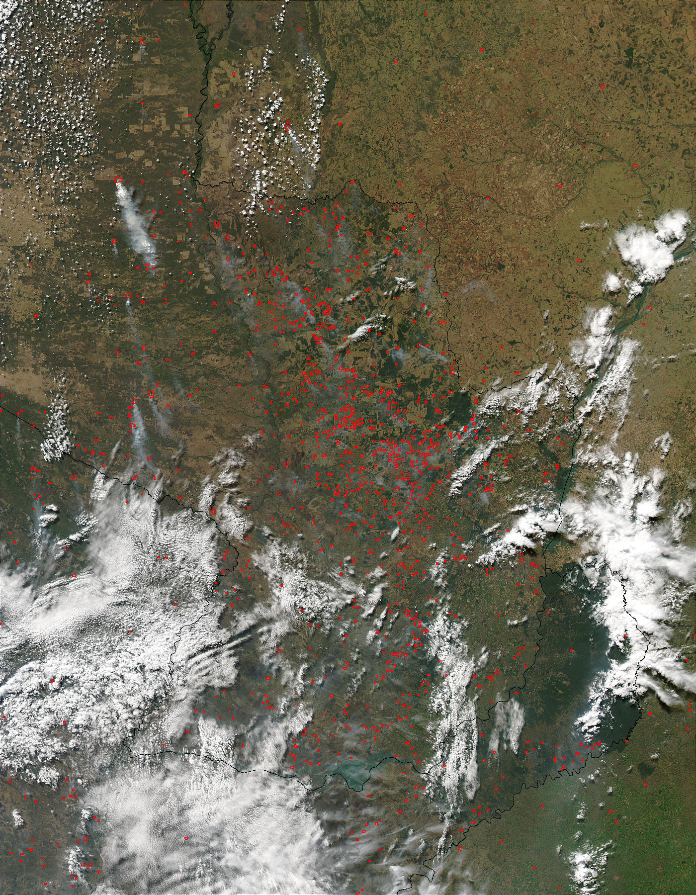 Hundreds of fires (marked in red) were detected across Paraguay (center) on August 13, 2003, by the Moderate Resolution Imaging Spectroradiometer (MODIS) on the Aqua satellite. Argentina is at bottom left of the scene, and Brazil is at right.