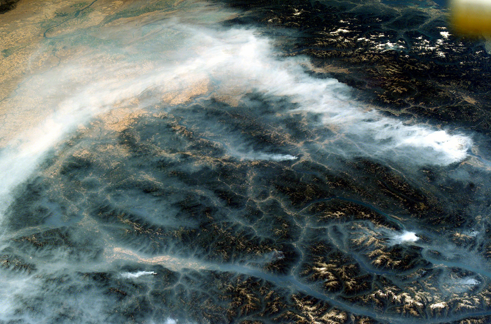 This image taken by the crew of the International Space Station on August 20, 2003, illustrates how smoke has become trapped in valleys. Normally air temperature decreases with altitude; in other words, the higher up you are, the colder it is. Warmer, more buoyant air near the surface of the Earth usually rises into the atmosphere, carrying away air pollutants such as smoke.