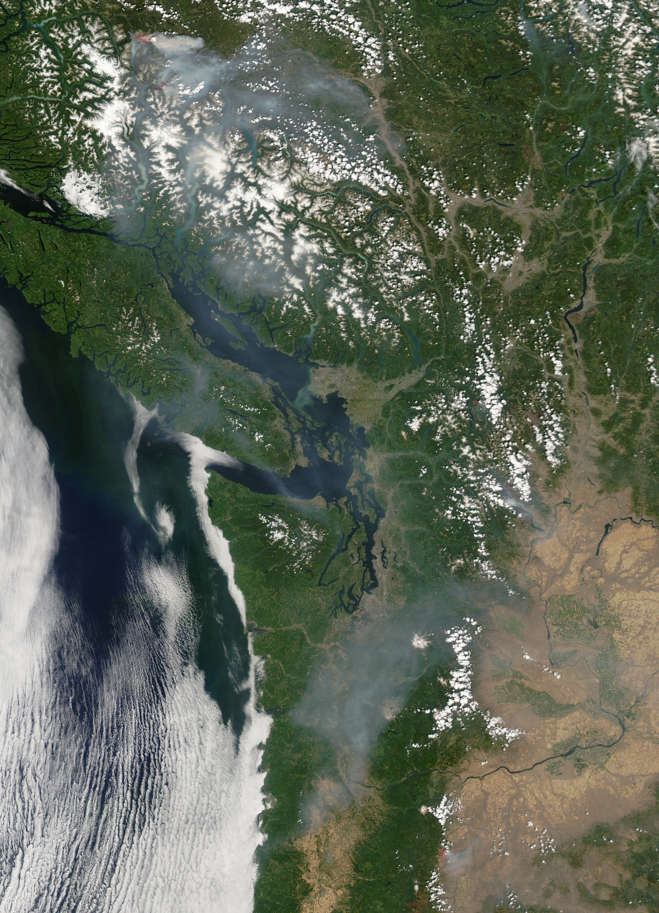A large fire in western British Columbia was spilling smoke down over the glacier-covered slopes of the Coast Range Mountains on July 28, 2004. In the deeply carved valleys between the white-capped peaks, turquoise rivers thick with finely ground glacial sediment flow out to the Pacific Ocean through the narrow gap between Vancouver Island (bottom left) and mainland Canada. The Moderate Resolution Imaging Spectroradiometer (MODIS) on NASA’s Aqua satellite captured this image, and the places where the sensor detected actively burning fires are outlined in red.