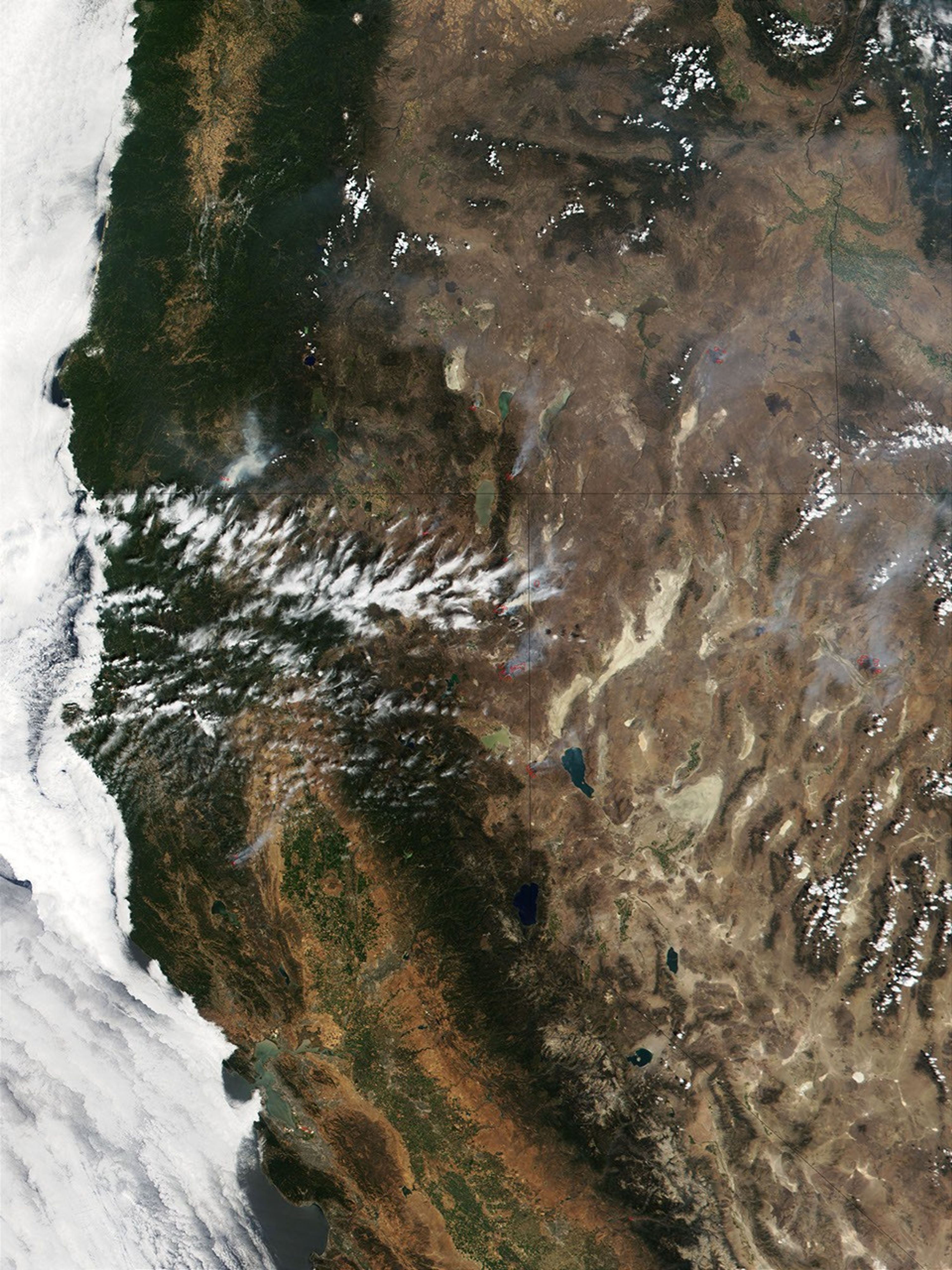 NASA’s Terra satellite passed over Oregon, California, and Nevada on Saturday, August 11, 2001, and the satellite’s Moderate-resolution Imaging Spectroradiometer (MODIS) detected several fires burning across those states. More than a dozen fires, which are indicated by red boxes, can be seen in the image sending out plumes of smoke blowing toward the northeast.