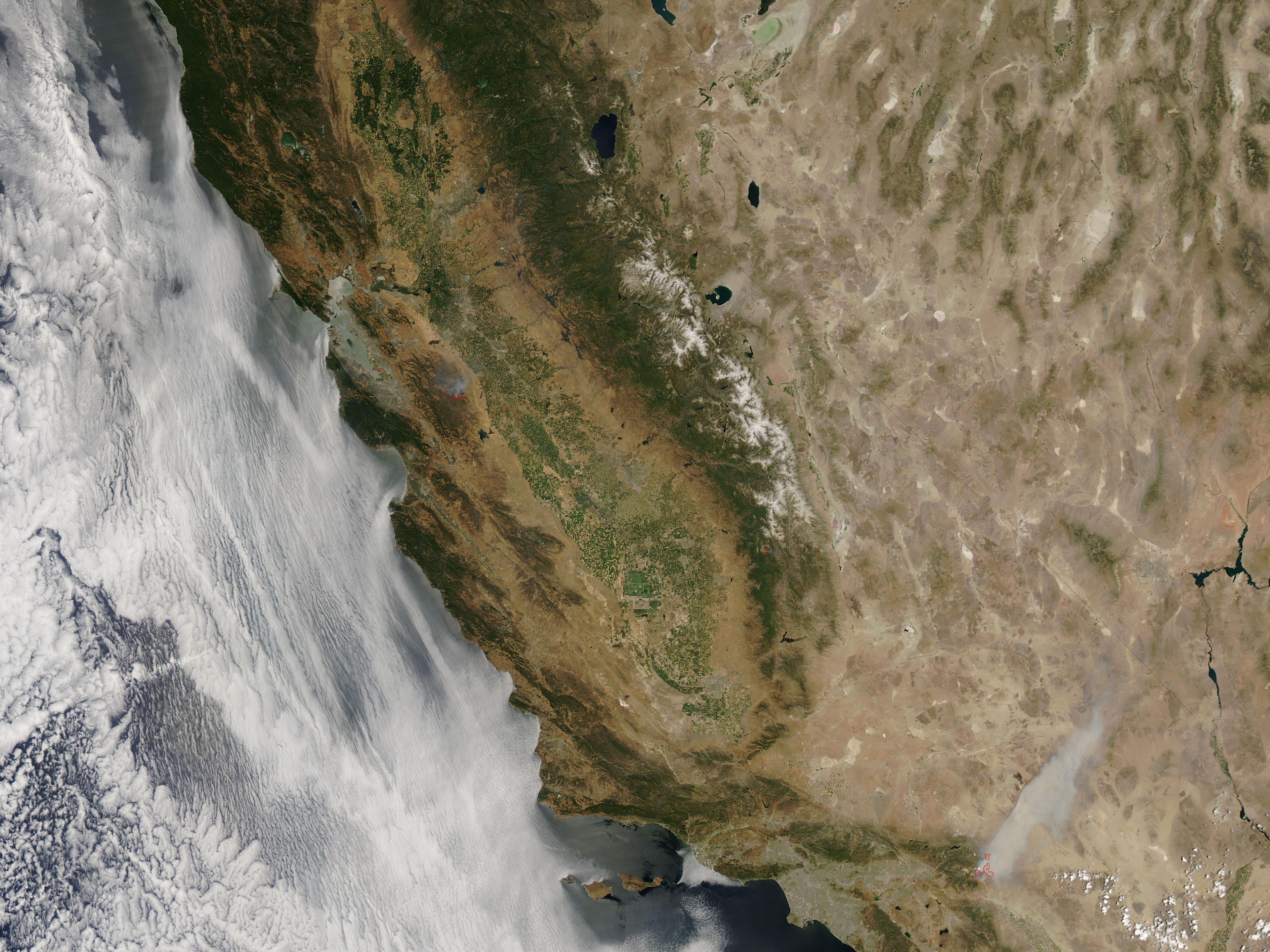 The high-resolution image provided above has a spatial resolution (level of detail) of 250 meters per image pixel. That image also shows a wider area, providing a view of the Canyon Fire, which is burning in the Diablo Mountains to the east of San Jose. The MODIS Rapid Response Team provides twice-daily images of this area in a variety of resolutions.