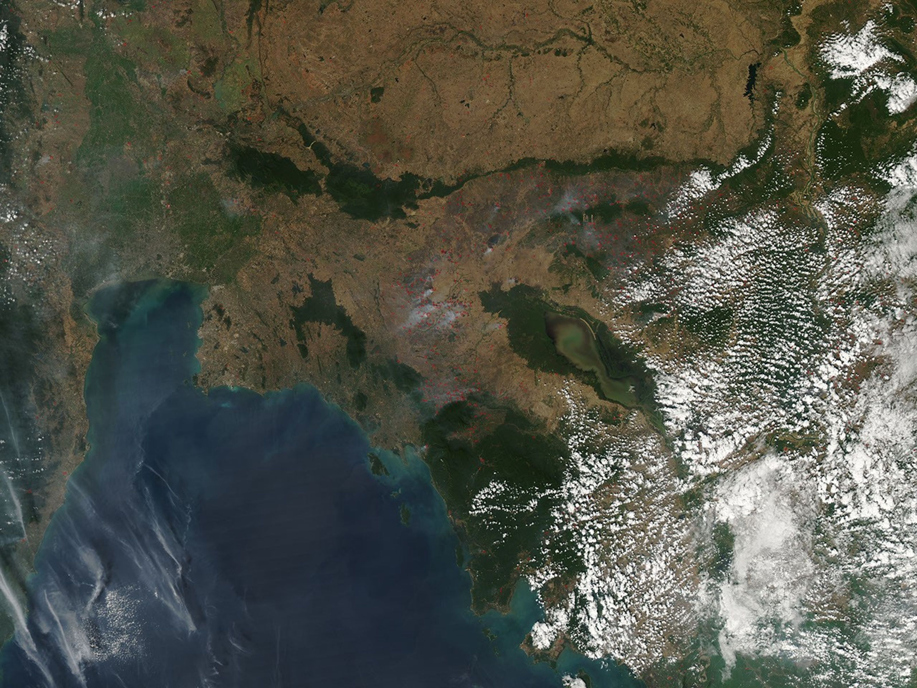 The Moderate Resolution Imaging Spectroradiometer (MODIS) on NASA’s Aqua satellite detected dozens of fires burning in western Cambodia on January 21, 2011. The fires are outlined in red. Most of the fires burn in grass or cropland, which is tan in this image. The deep green forest that surrounds the Tonle Sap and exists in fringes elsewhere is mostly free of fires.