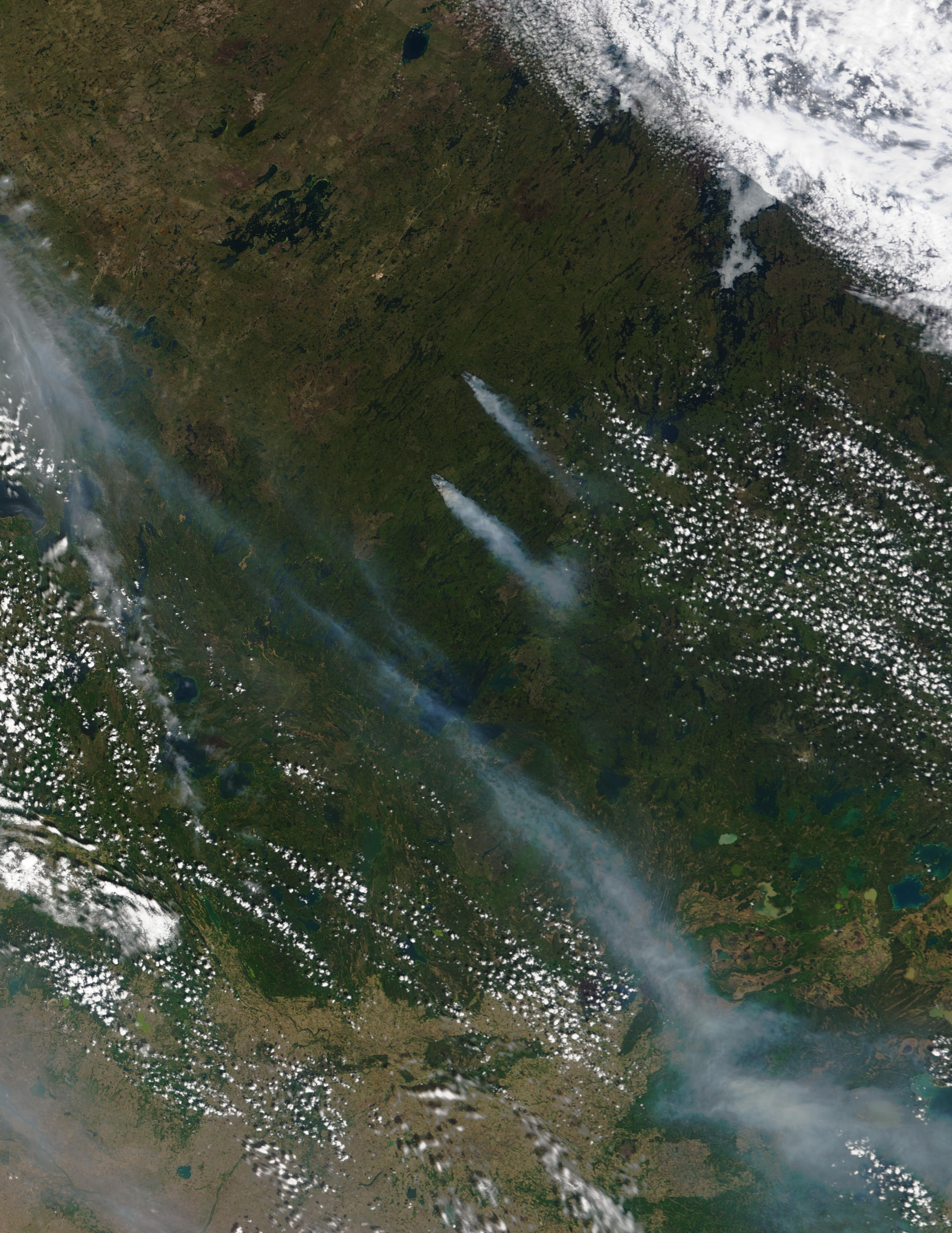 Smoke from several large prairie fires in Saskatchewan, Canada, is visible in this image from the Moderate Resolution Imaging Spectroradiometer (MODIS) on June 15, 2002.