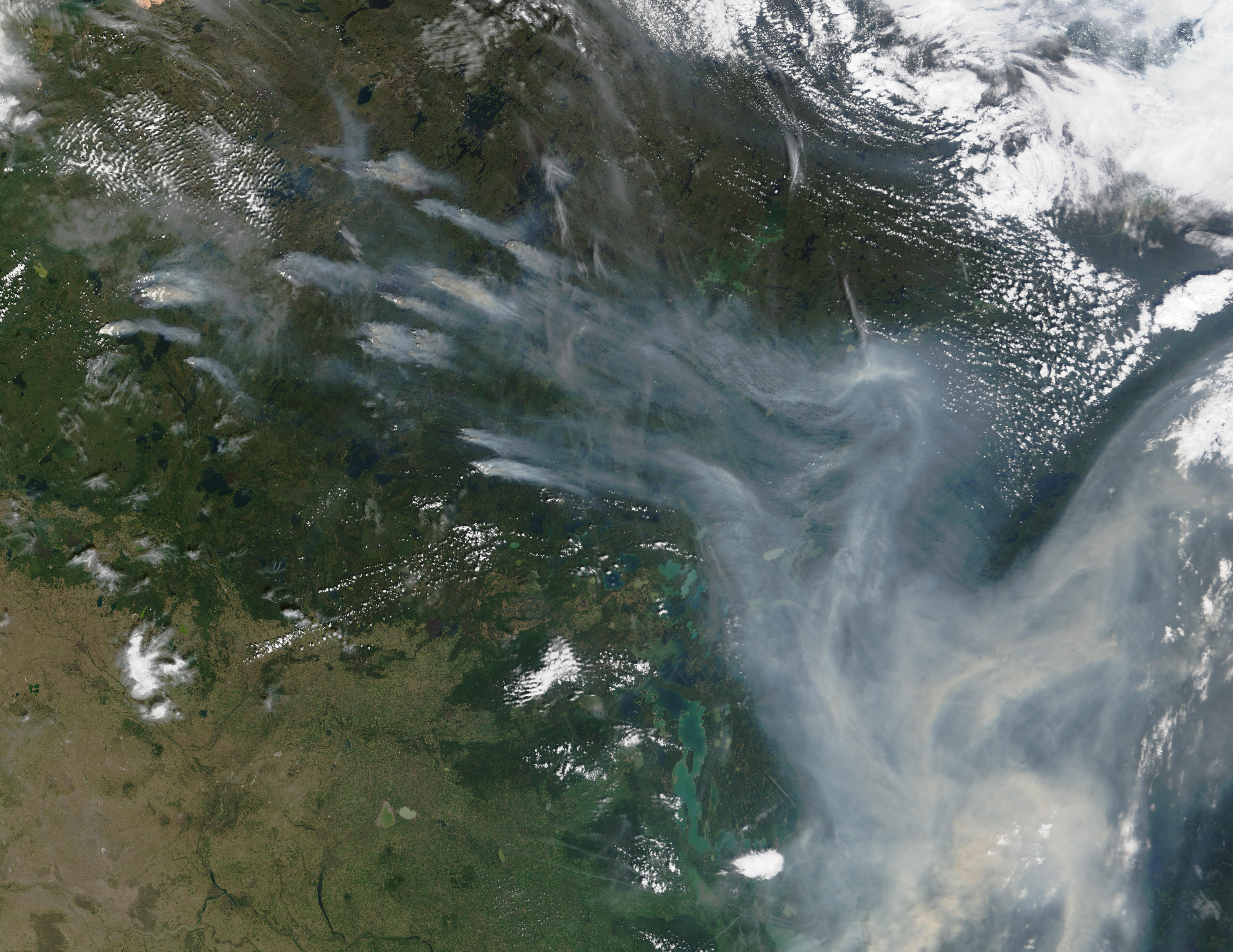 Smoke is billowing from fires in Canada’s Saskatchewan region and may be mixing with smoke from wildfires in the western United States at the lower right of this Moderate Resolution Imaging Spectroradiometer (MODIS) image from June 26, 2002. According to reports from the Canadian Interagency Forest Fire Center, lightning ignited 15 fires in a single 24-hour period from Tuesday, June 25, 2002, to Wednesday, June 26.