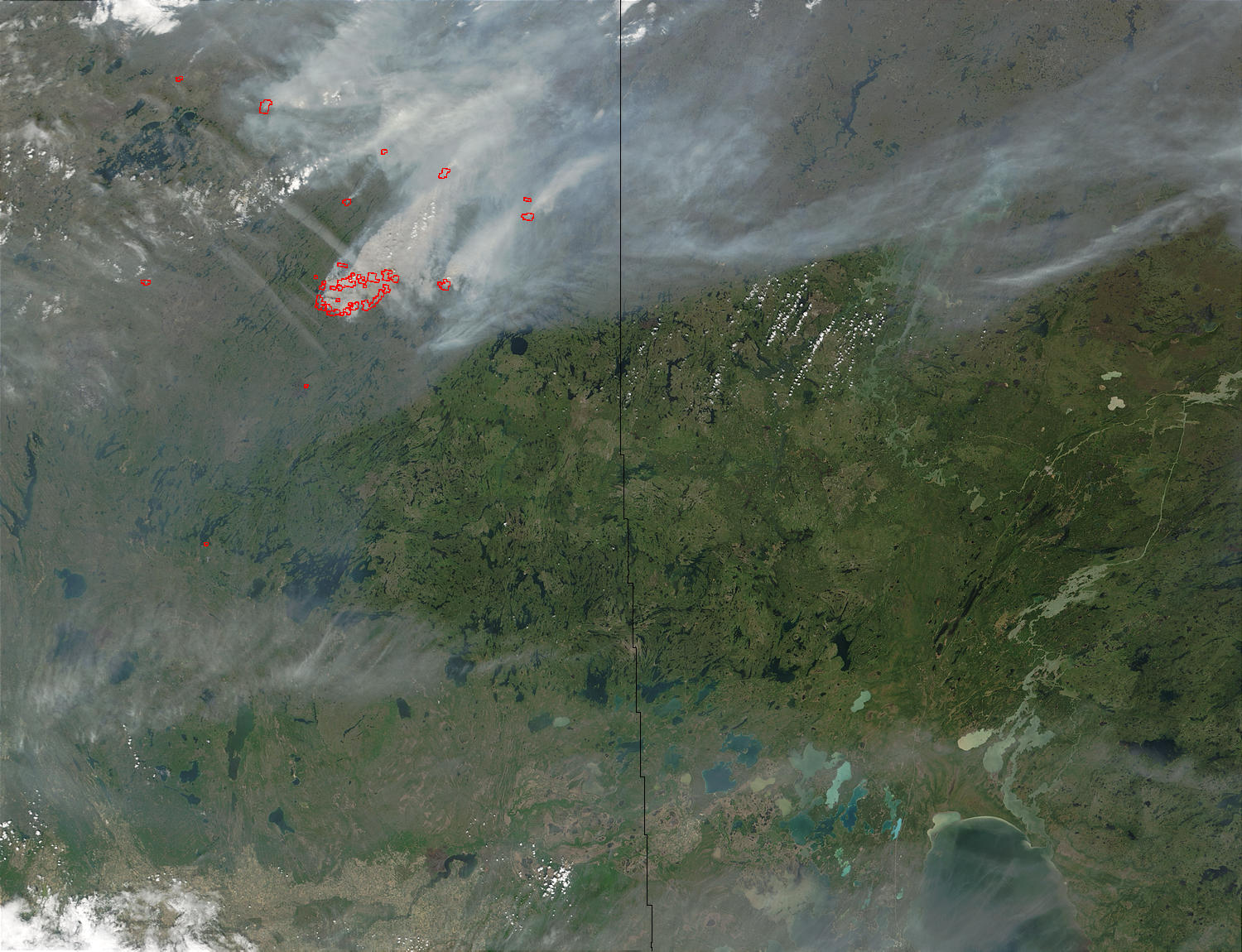 This Moderate Resolution Imaging Spectroradiometer (MODIS) image from June 23, 2002, shows heavy smoke from numerous wildfires (red dots) blanketing Saskatchewan (left) and Manitoba (right), Canada.