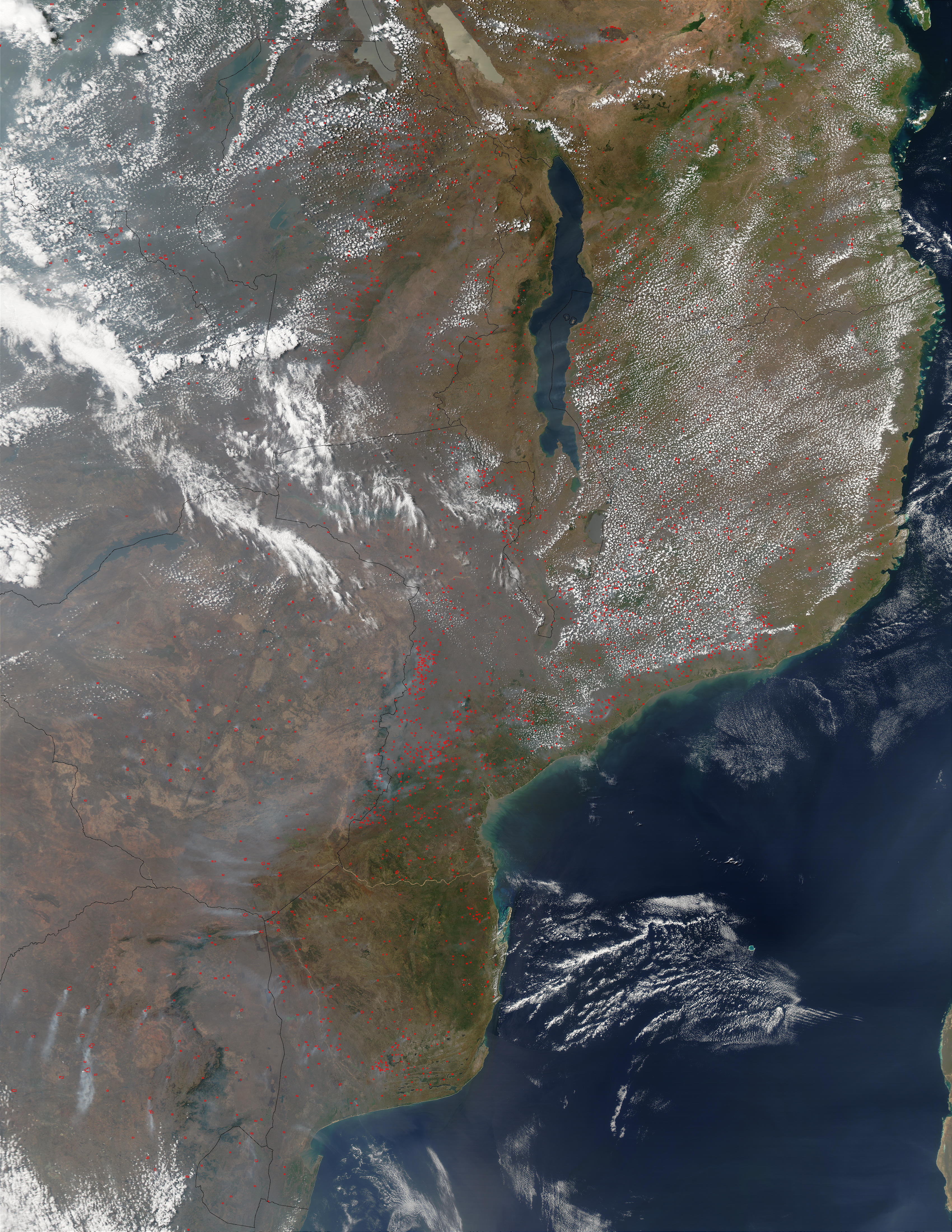 Even for a region that sees a lot fires during the agricultural season, this scene seems to reveal an exceptional number of fires for countries from east-central to southern Africa. This true-color image was acquired by the Moderate Resolution Imaging Spectroradiometer (MODIS) on the Aqua satellite on September 25, 2002. Hundreds of fire detections are indicated by red dots. In the top center of the image is Lake Malawi, which is bounded on the west by Malawi, on the northeast by Tanzania, and on the southeast by Mozambique. Other countries visible in the image are (north-south along left edge) Democratic Republic of Congo, Zambia, Zimbabwe, Botswana, Republic of South Africa, and Swaziland (bottom center). Agricultural fires have been part of the ecological cycles in Africa for perhaps thousands of years, used to clear land and regenerate pasture. Scientists are studying these cycles to assess their impact on air quality, global warming, and ecosystem change.