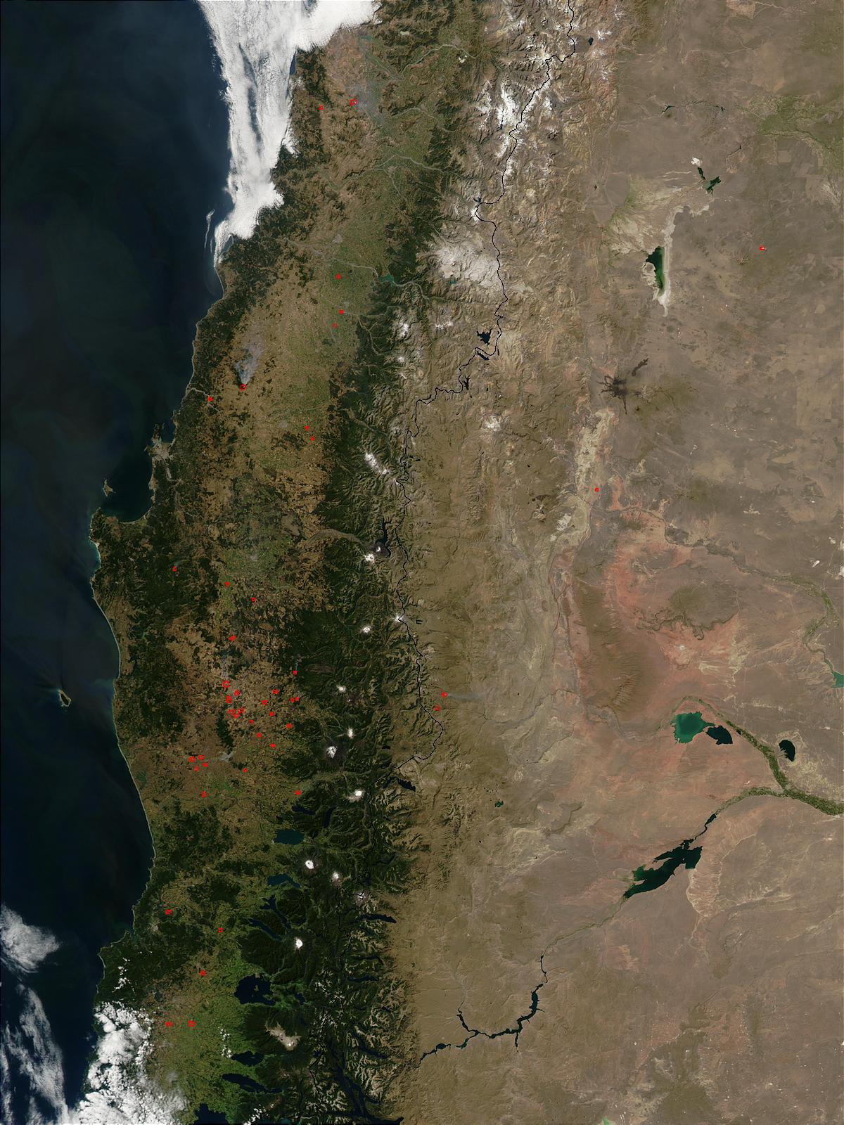 This Moderate Resolution Imaging Spectroradiometer (MODIS) image from the Aqua satellite on March 21, 2003, shows fires (red dots) burning in central Chile (left) in South America. At right is Argentina.
