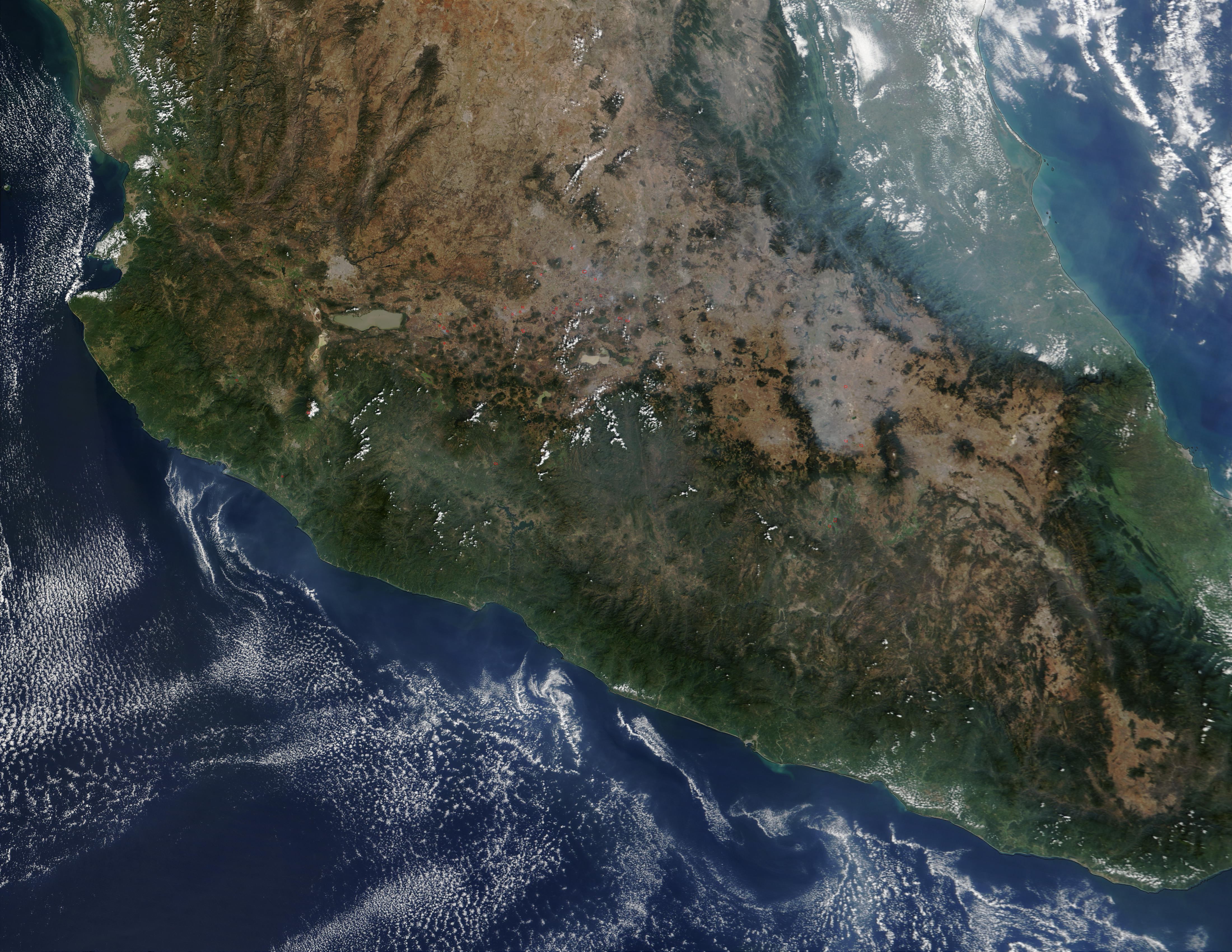Set against the sapphire blue waters of the Pacific Ocean and Gulfof Mexico, central Mexico boasts a dazzling array of colors andlandscapes, from verdant green tropical forests to black mountains tocaramel-colored, high-altitude deserts. The Sierra Madre OccidentalMountains march down the western portion of Mexico, while the SierraMadre Oriental Mountains march down in the east. Mexico City, thecountry's capital, sits in a small valley to the right of the imagecenter, and is very near three small fires, marked in red. To theleft of Mexico City is the city of Toluca, which appears as a small,dark gray smudge. Far to the west, north of the Laguna de Chapala(left of center), is the city of Guadalajara, which appears grayishbrown against the southern reaches of the darker, brown-black SierraMorone Mountains.