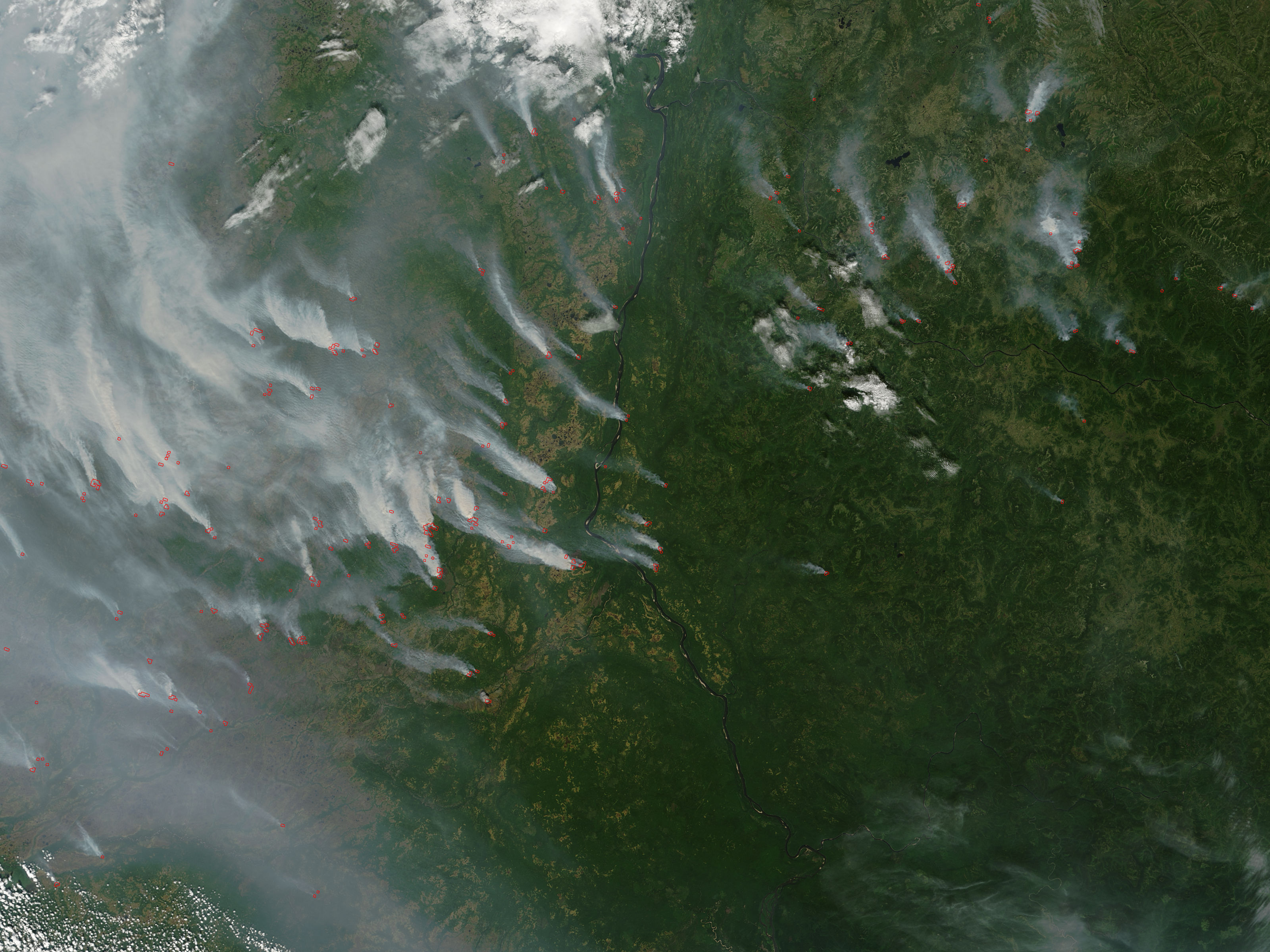 Across the lowlands of the Central Siberian Plain in central Russia, dozens of large fires were filling the skies with thick, white smoke on August 1, 2005, when the Moderate Resolution Imaging Spectroradiometer (MODIS) on NASA’s Terra satellite captured this image. The larger version of the image shows another cluster of large fires burning on the eastern side of the north-flowing Yenisey River. The Yenisey is a geographic dividing line between the Central Siberian Plain to the west and the higher elevations of the Central Siberia Plateau to the east.