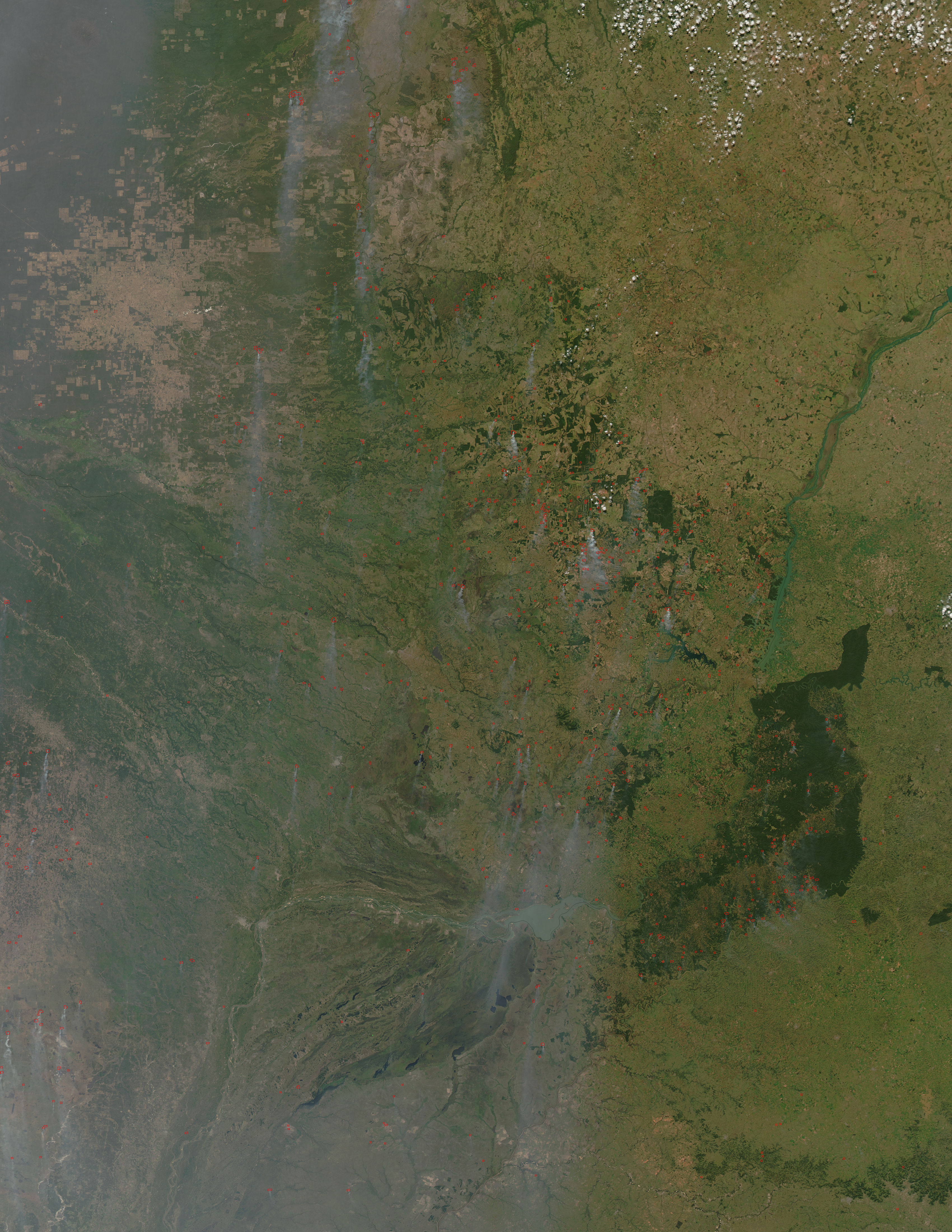 In central South America on August 2, 2005, hundreds of active fires were detected by the Moderate Resolution Imaging Spectroradiometer (MODIS) on NASA’s Aqua satellite when it flew overhead. The active fire locations are marked in red on the scene. Fires, probably agricultural fires, are scattered across Brazil, Paraguay, and Argentina, including the peninsula-like Misiones province of Argentina, where some of the last remnants of the rainforest ecosystem known as “Atlantic Forest” are found. Scientists believe the ecosystem, distinct from the Amazon, once stretched thousands of kilometers along the coast of South America and reached inland several hundred kilometers. Like the forests of eastern North America, most of the “Mata Atlantica” fell to European settlers hundreds of years ago.