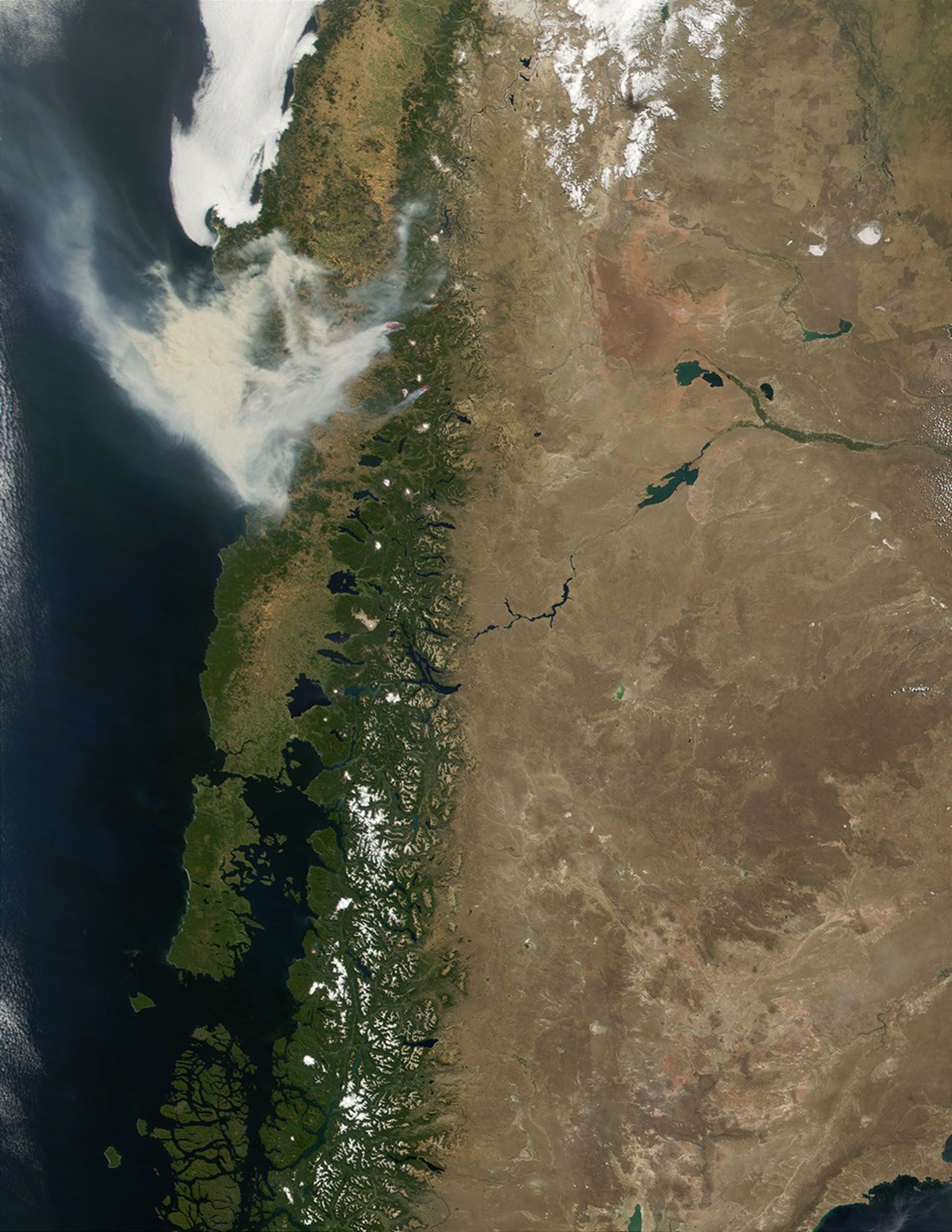On February 5, 2002, the dense smoke from numerousforest fires stretched out over the Pacific Ocean about 400 miles south of Santiago, Chile.This true-color Moderate-resolution Imaging Spectroradiometer (MODIS) image shows the fires, which are located near the city of Temuco. The fires are indicated with red dots (boxes in the high-resolution imagery). Thefires were burning near several national parks and nature reserves in an area of the Chilean Andes where tourism is very popular. Southeast of the fires, the vegetation along the banks of the Río Negro in Argentina stands out in dark green.