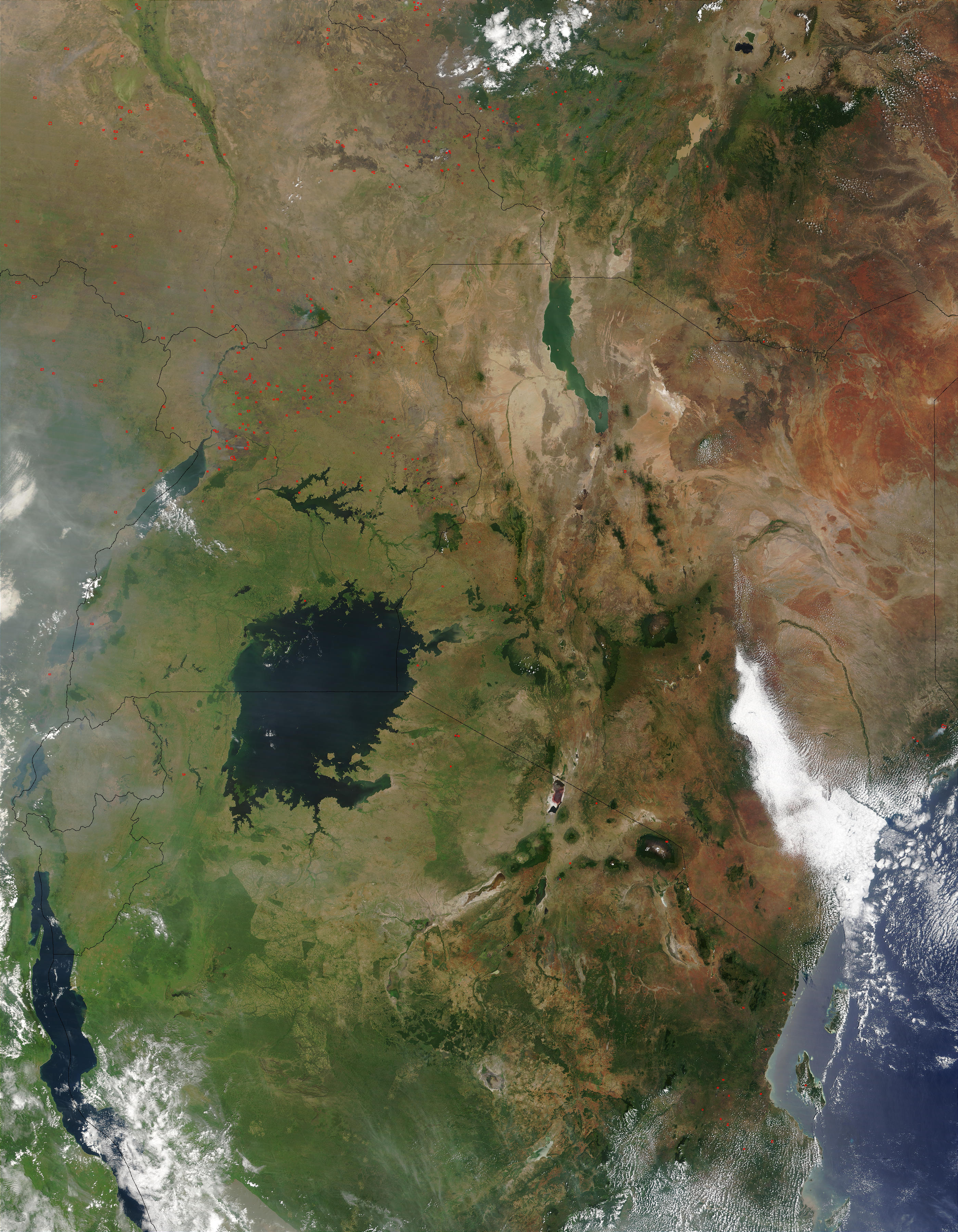 North of Lake Victoria in eastern Africa fires (red dots) were scattered across the savanna, and were detected by the Moderate Resolution Imaging Spectroradiometer (MODIS) on the Terra satellite on February 2, 2003.