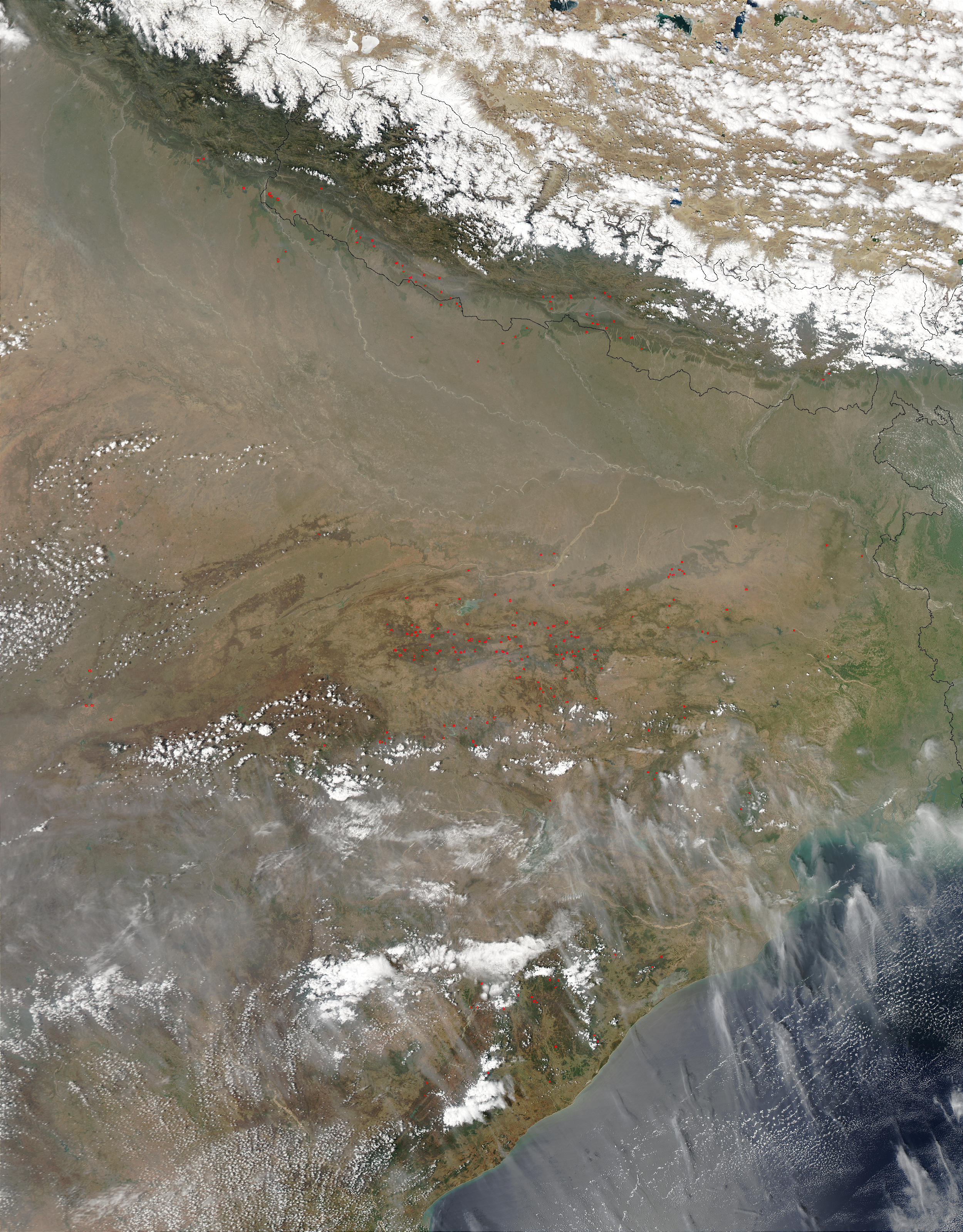 On April 11, 2003, the Moderate Resolution Imaging Spectroradiometer (MODIS) on the Aqua satellite captured this image of fires (red dots) burning in eastern India, southwest of the Ganges River, which stretches out diagonally across the image. Fire activity has risen and fallen over the past month as agricultural activities get underway. Fires are also visible beneath the clouds along the eastern coast.