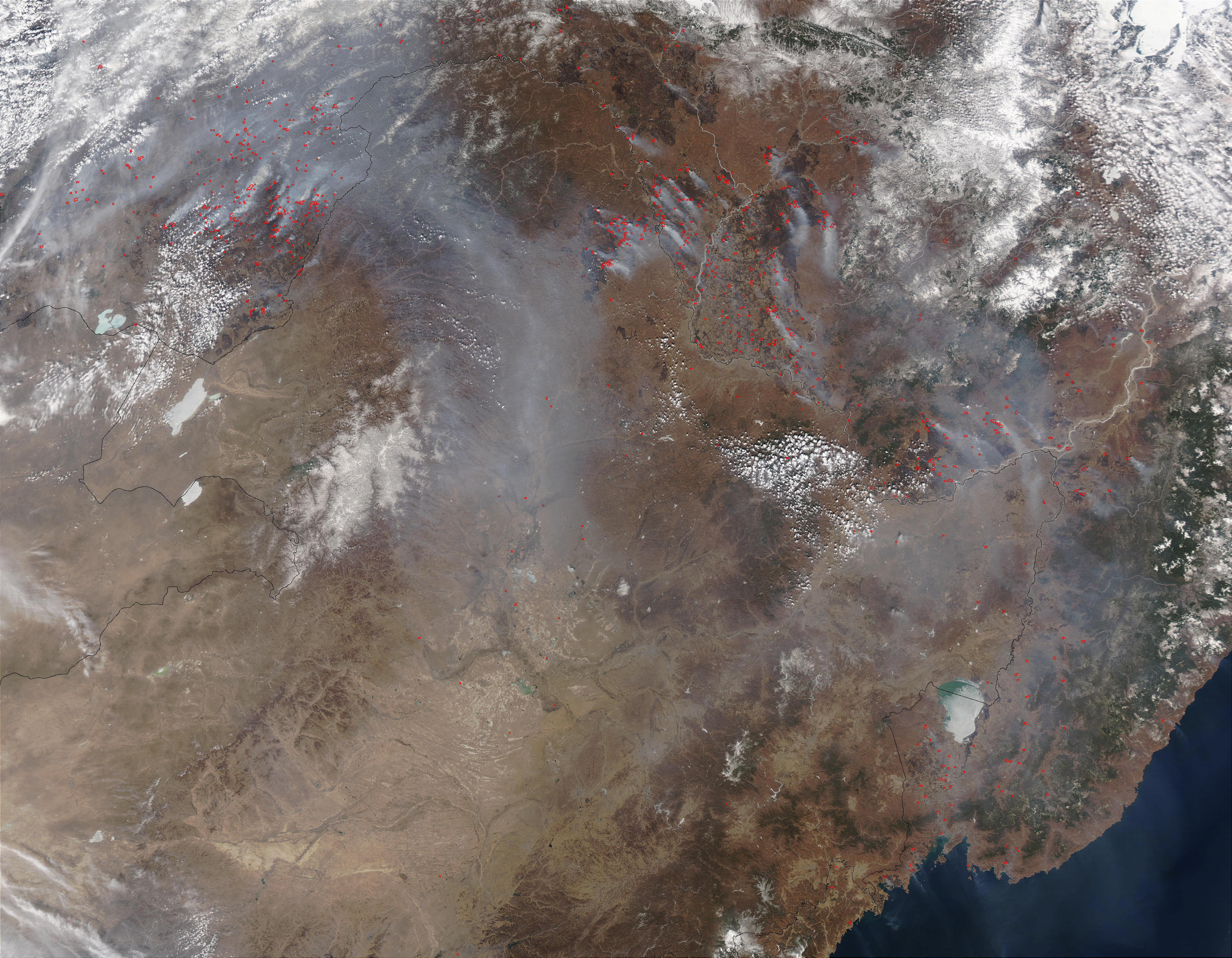 In eastern Asia, farmers are preparing land for springtime agricultural activities, using fire to clear fields and to stimulate renewal of pasture. This image from the Moderate Resolution Imaging Spectroradiometer (MODIS) on the Aqua satellite on April 9, 2003, shows scores of fires (red dots) and smoke across Russia (top) and China (center). Large dark burn scars show the extent of the burned areas.