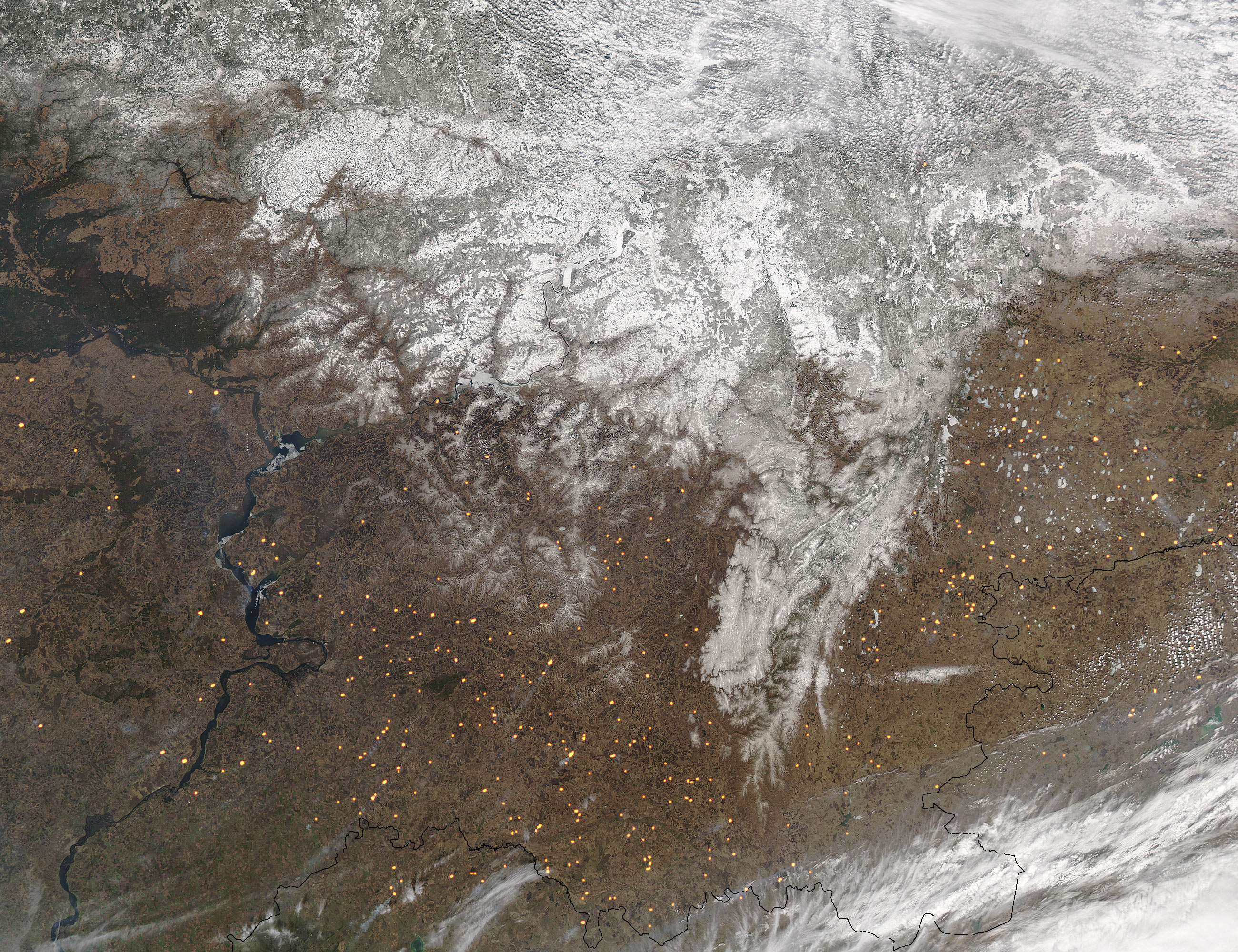 Snow was retreating northward, ice was breaking up in Volga River (left), and springtime agricultural fires (yellow) were burning in western Russia on April 24, 2004, when this image from the Moderate Resolution Imaging Spectroradiometer (MODIS) on the Aqua satellite was captured. Fires have been marked in yellow, and they stretch from Russia (top) across the border into northern Kazakhstan.