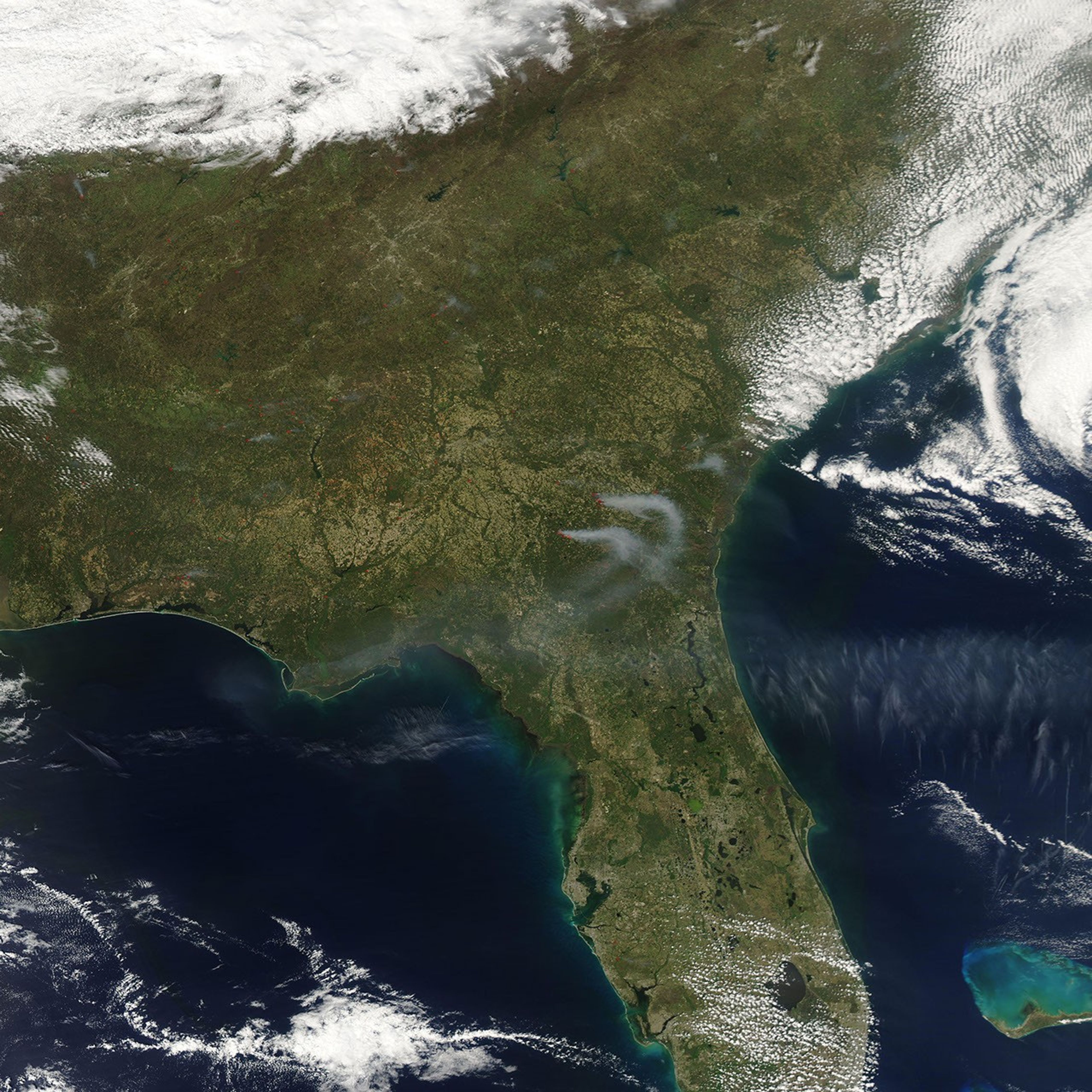 The U.S. Forest Service identified the fires as being the Sessom Community Fire and the Elm Church Road Fire. They were among at least 11 large fires burning in Georgia on March 25. The Elm Church Road fire burned 2,000 acres on March 24, threatening the town of Cogdell, said the Georgia Forestry Commission. The fire was clearly still large the next day, when this image was taken. Georgia’s governor declared a state of emergency in the counties where the two large fires were burning.
