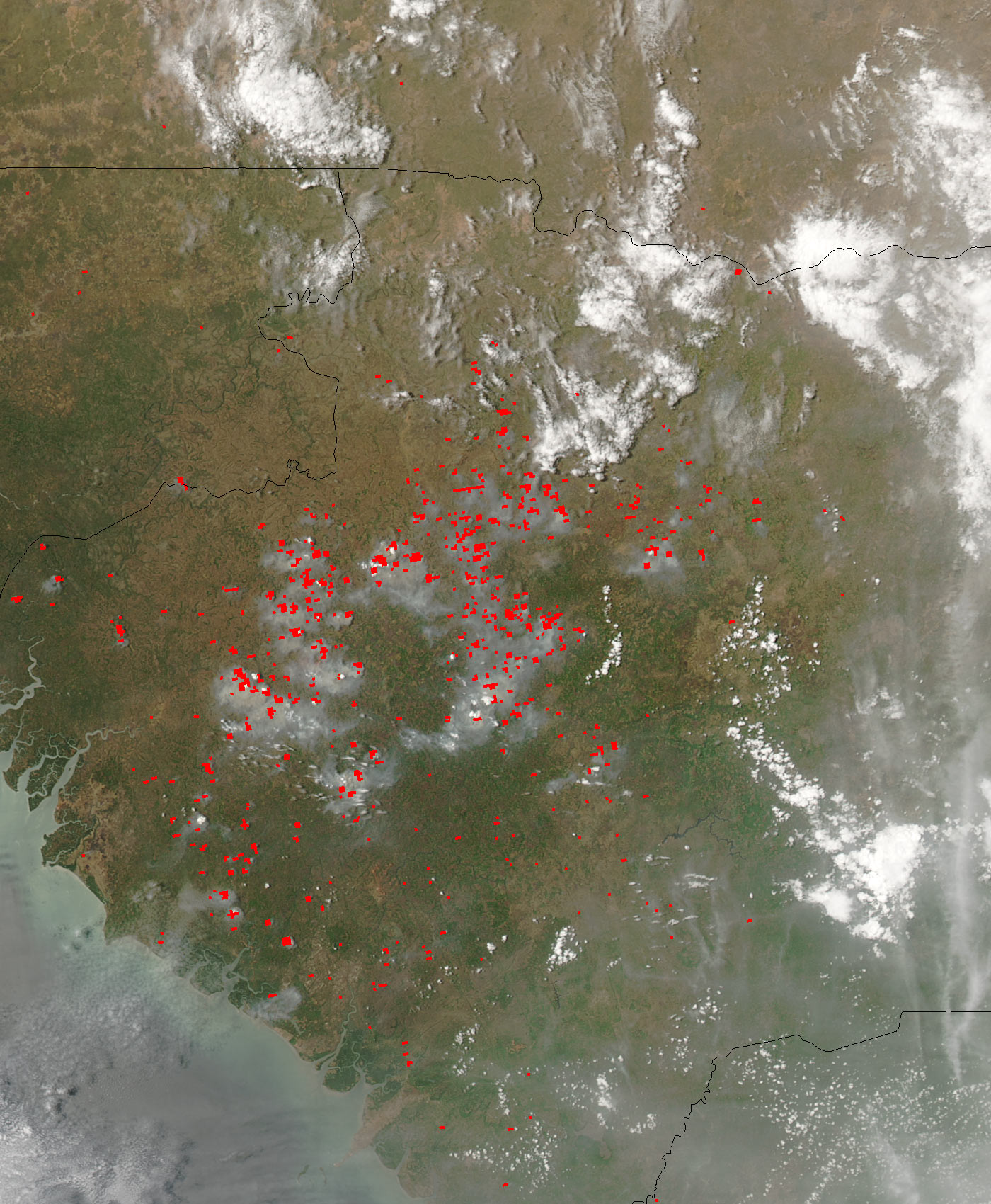 On April 27, 2004, the Moderate Resolution Imaging Spectroradiometer (MODIS) on the Aqua satellite captured this image of scores of smoking fires (red dots) burning in the West African country of Guinea. Though some fires are burning in the coastal regions, most are concentrated in the Fouta Djallon Highlands in the central part of the country, the country’s agricultural heart.