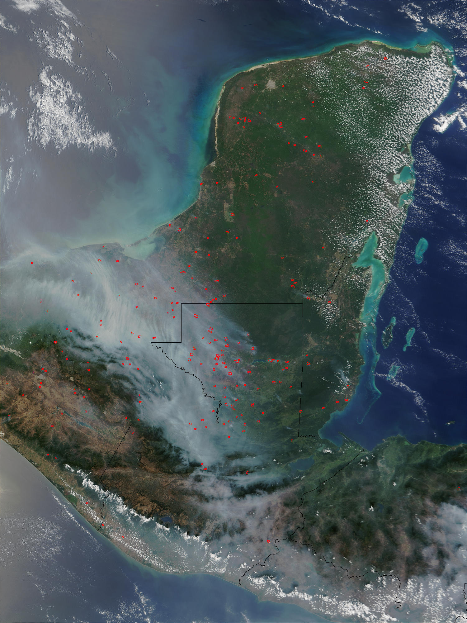 Fires (red dots) in Mexico and Guatemala are spreading thick smoke over the region and northward over the Gulf of Mexico. This image of the fires was captured by the Moderate Resolution Imaging Spectroradiometer (MODIS) on the Terra satellite on April 17, 2003.