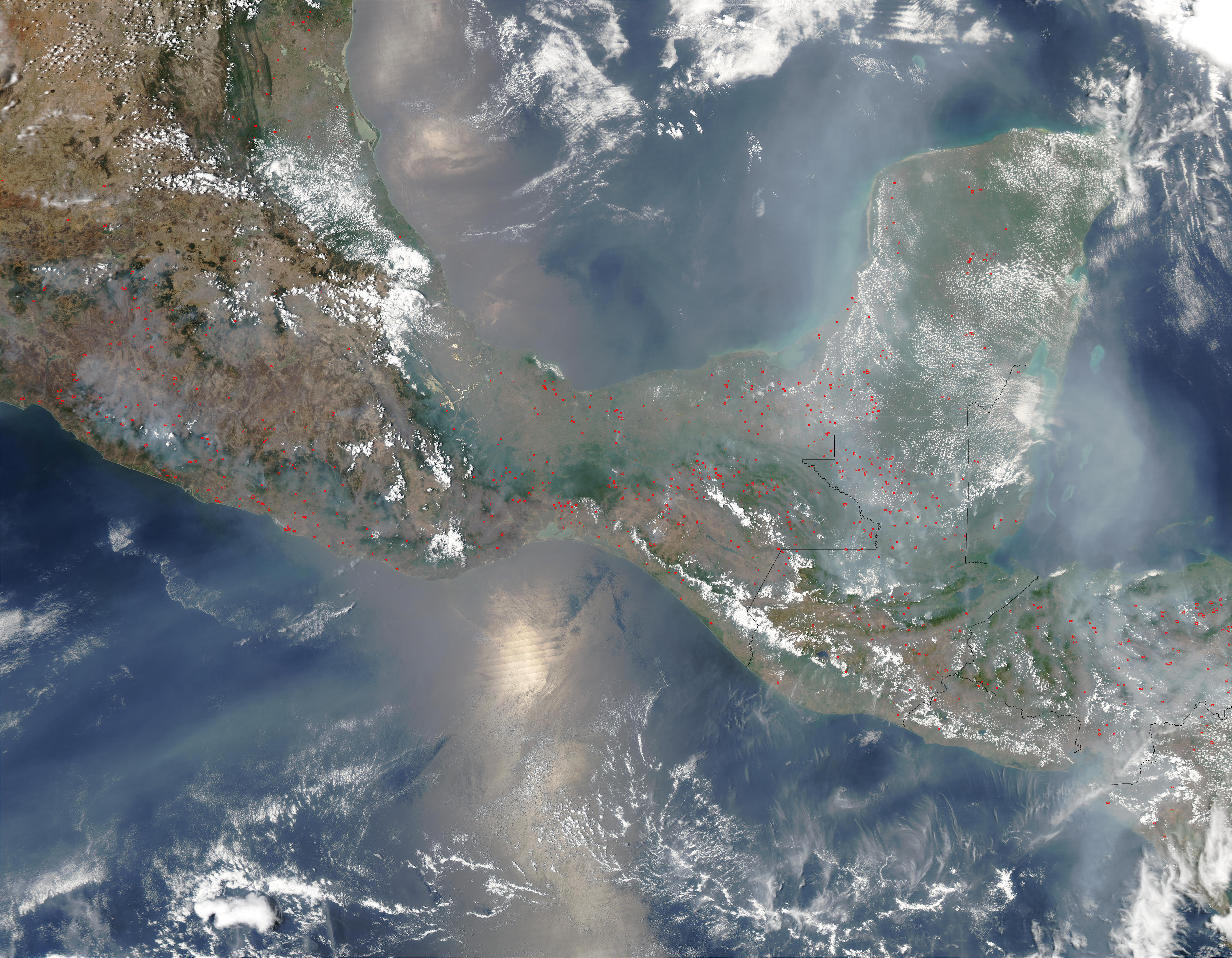 A thick haze of smoke covers southern Mexico and Central America in this true-color Moderate Resolution Imaging Spectroradiometer (MODIS) image from the Aqua satellite on April 30, 2003. Although fire is commonly used in agriculture to clear land for planting crops, such fires can easily get out of control and grow into wildfires. In Nicaragua (bottom right corner), forest fires have been raging for the past three months, and have destroyed crops, tree plantations, and forests. The fires in this image are marked in red. They are spread across southern Mexico (top), then in Guatemala (south of Mexico), Honduras (to the east) and El Salvador (to the south), and Nicaragua. Smoke is spreading out over the Gulf of Mexico (top) and the Caribbean Sea (right).