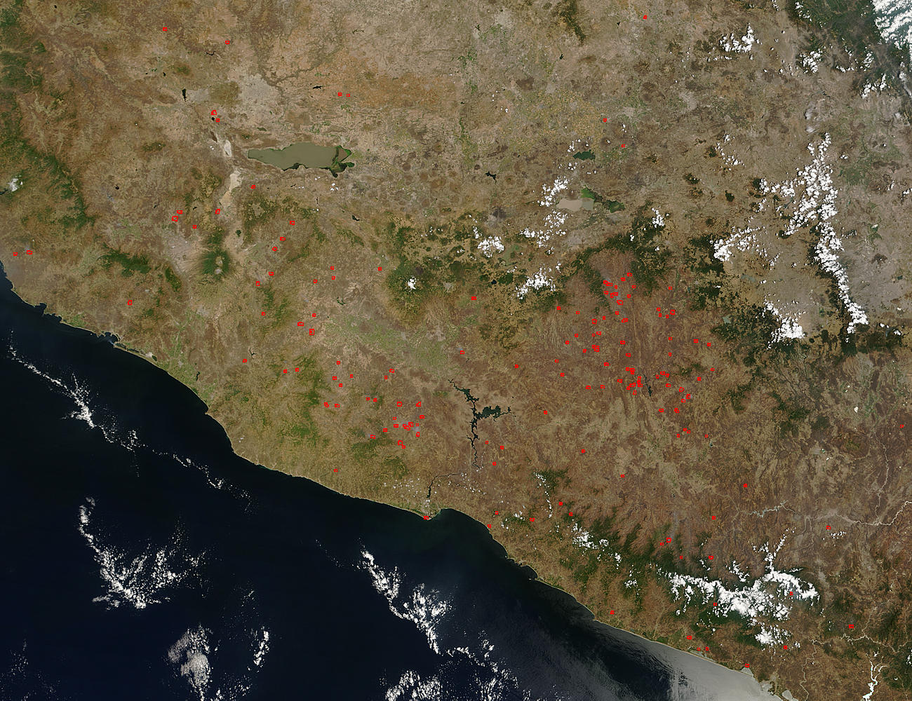 On April 24, 2004, the Moderate Resolution Imaging Spectroradiometer (MODIS) on the Terra satellite captured this image of southern Mexico and numerous fires (red dots) burning the region around Lake Chapala (top, left of center).