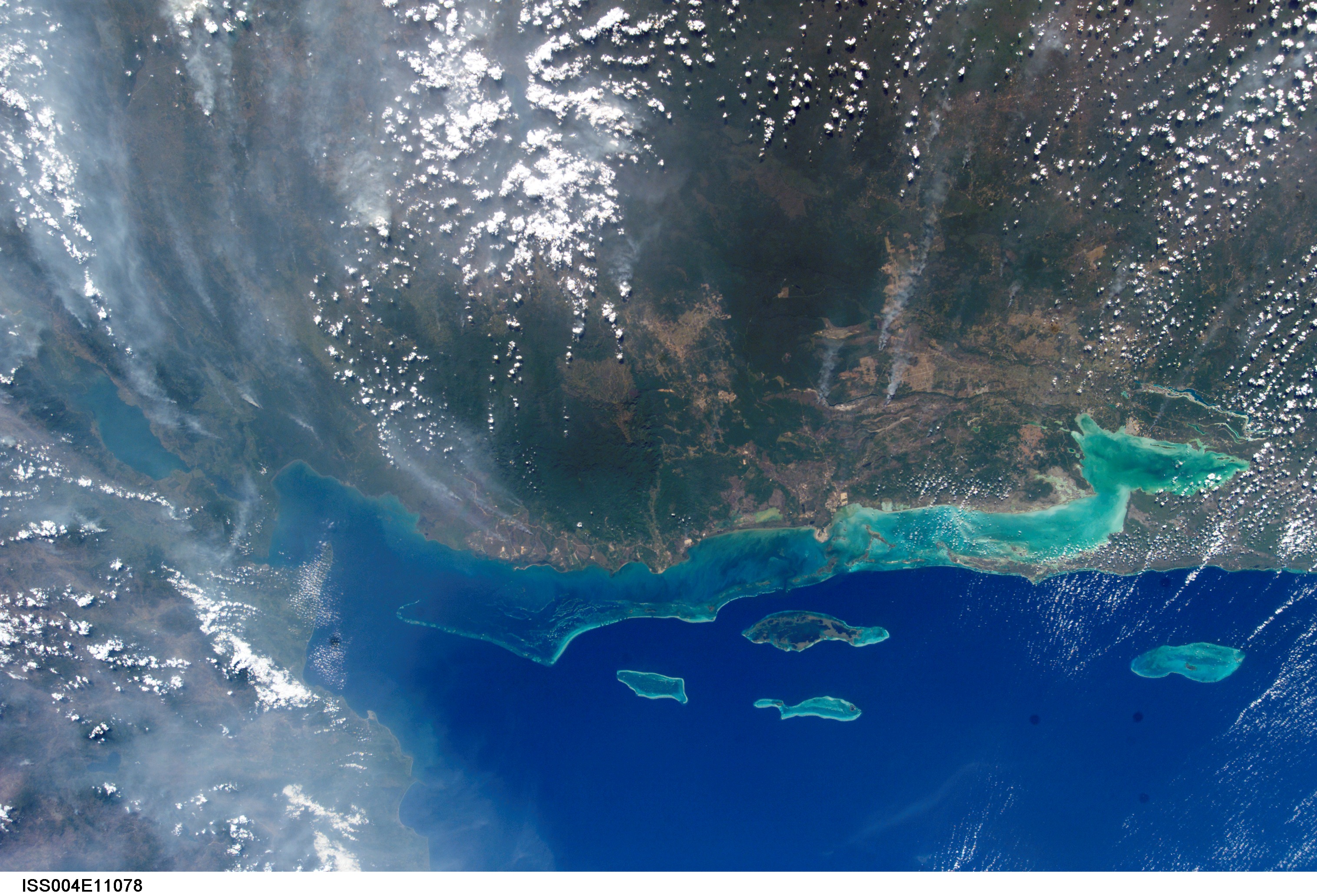 The bright blue water of the Gulf of Honduras contrasts sharply with the smokey pall over Guatemala and Belize in this photograph taken from the International Space Station. Fires in the Yucatan Penninsula and northern Central America began burning in early April, and intensified by the end of the month.