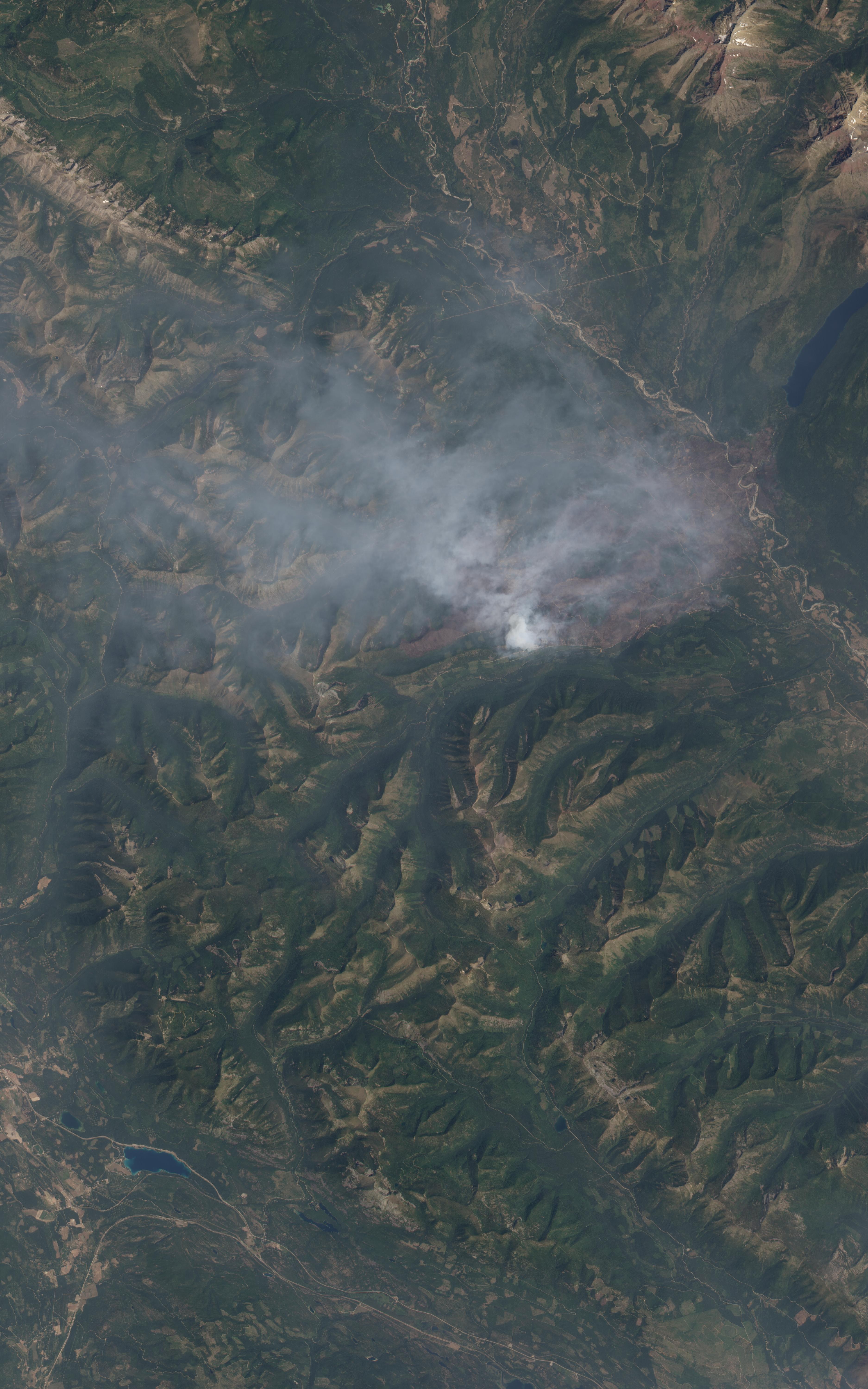 Through a shroud of smoke, the scorched, brown landscape left by the Wedge Canyon Fire in northwest Montana is visible in this image from the Advanced Land Imager sensor on the Earth Observing 1 satellite. The brown scar stretches over the tan ribbon of the Flathead River, which runs diagonally from top center to right center edge. At the time this image was acquired on July 29, 2003, the southwest perimeter of the fire appears most active, with a thick cloud of smoke rising from the fire. The Wedge Canyon Fire is one of three large fires burning in the mountainous terrain of northwestern Montana near Glacier National Park.