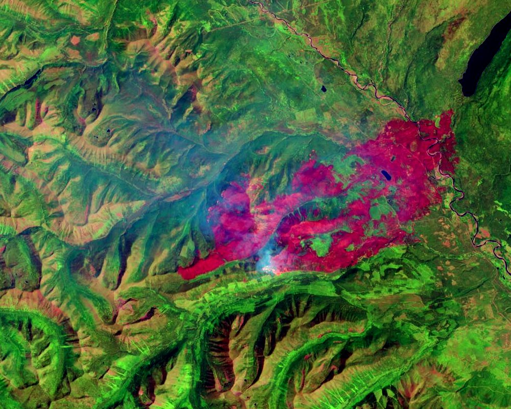 The scar stretches over the thin blue ribbon of the Flathead River, which runs diagonally from top center to right center edge. At the time this image was acquired, the southwest perimeter of the fire appears most active, with a thick cloud of smoke rising from the fire. Hot spots along the perimeter appear bright orange. The Wedge Canyon Fire is one of three large fires burning in the mountainous terrain of northwestern Montana near Glacier National Park.