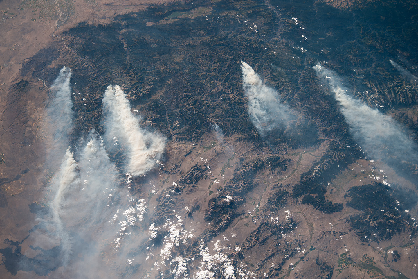 Within this mountainous region (the dark areas are all wooded), several fires produced extensive smoke plumes. The densest smoke appeared to be generated by a combination of the Little Queens and Leggit fires (within the Salmon River Mountains). This image shows the common pattern of westerly winds carrying smoke in an easterly direction, as seen during the wildfire season of one year ago.
