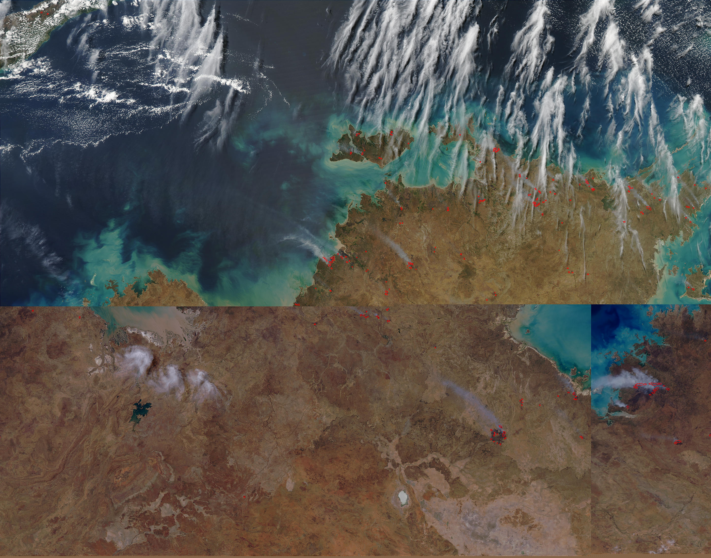 Dozens of active fire detections (red dots) were made across Northern Australia on September 3, 2003, by the Moderate Resolution Imaging Spectroradiometer (MODIS) on the Aqua satellite. The scene shows Western Australia (left) and Northern Territory (right). Much of the land in this part of the country is rangeland or farmland, and these fires are likely planned burns that have been set as part of a natural resource management strategy.