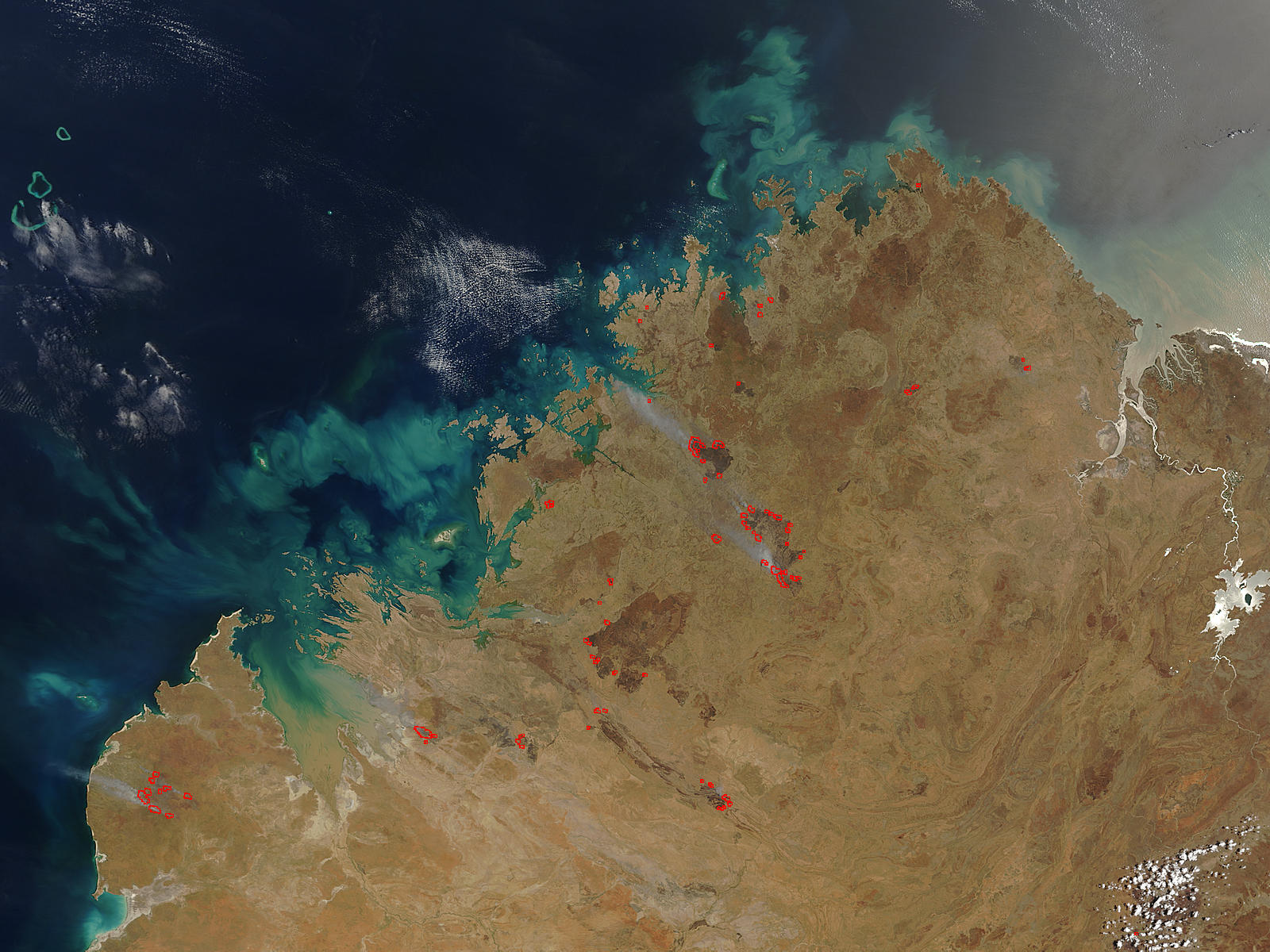 Fires are spread across a large swath of the Kimberley Plateau in the northern part of Western Australia in this Moderate Resolution Imaging Spectroradiometer (MODIS) image captured by the Terra satellite on November 8, 2003. Several of the active fires (marked with red dots) have burned large areas, which appear deep brown against the paler tan savanna landscape.