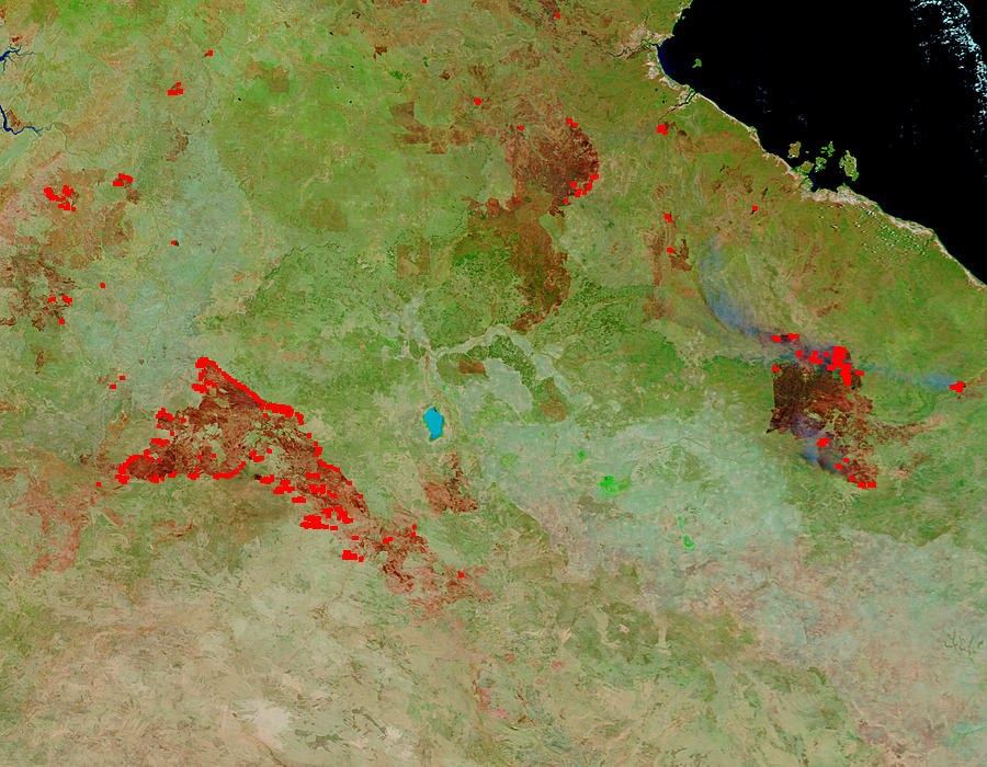 In the dry grasslands and savannas of eastern Northern Territory, Australia, bushfires spread rapidly in dry fuels during the transition from dry season to wet. This pair of images from the Moderate Resolution Imaging Spectroradiometer (MODIS) on NASA’s Terra satellite shows how rapidly three large fires spread between October 10 and 11, 2004. Vegetation is light green, actively burning parts of the fires are marked in red, and the burned areas appear bright reddish-brown. Naturally bare soil or low vegetation is tan or pinkish tan. The blue jewel in the center of the scene is the salty Lake Woods. This high-resolution image provided above is the October 11 image at 1-kilometer spatial resolution. Additional resolutions for October 10 and October 11 are provided by the MODIS Rapid Response Team.