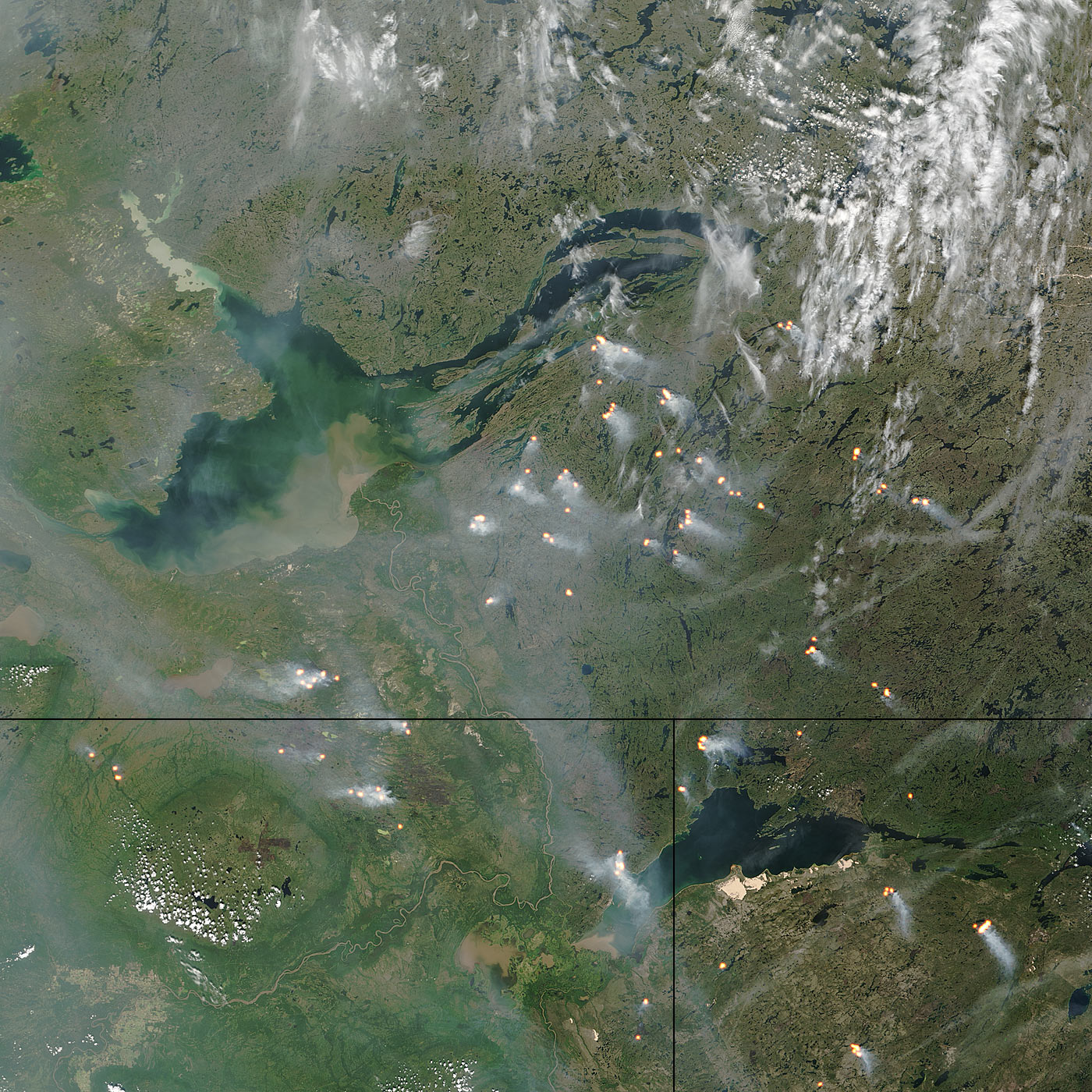 In the central portion of Canada’s Northwest Territories (top), Alberta (bottom left), and Saskatchewan (bottom right), dozens of fires were burning across the summer-green landscape on July 22, 2004. Most of the fires (marked in yellow in the image) are located southeast of Great Slave Lake in the top portion of the image. According to statistics provided by the Canadian Interagency Forest Fire Center, both the Northwest Territories and Alberta are having a much more active fire season this year than last. Both provinces have recorded nearly double the number of fires so far in 2004 than they had at this time in 2003. Burned acreage is nearly seven times what it was at this time in summer of 2004. Saskatchewan presents a mixed picture—fewer fires so far in the 2004 season, but about 1.5 times the acreage has burned compared to 2003.